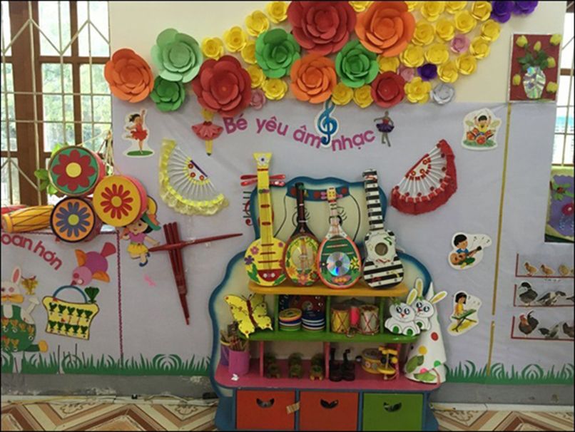 Thứ năm, bố trí góc nghệ thuật trong lớp học. Góc âm nhạc là một trong những nơi cần đến một cách bố trí các góc trong lớp học mầm non thật khoa học. Đây là nơi kích khởi tiềm năng của trẻ thông qua các trò chơi, hoạt động sáng tạo cho bản thân.