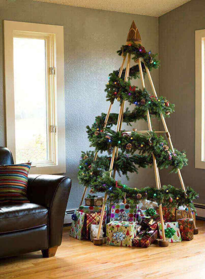 Hình dạng của một cái thang khiến cho nó trông rất giống cây thông. Nếu bạn có một cái thang chữ A, hãy treo nó lên với những ánh đèn, đồ lưu niệm nhỏ, đồ trang trí và một ngôi sao hiện đại.