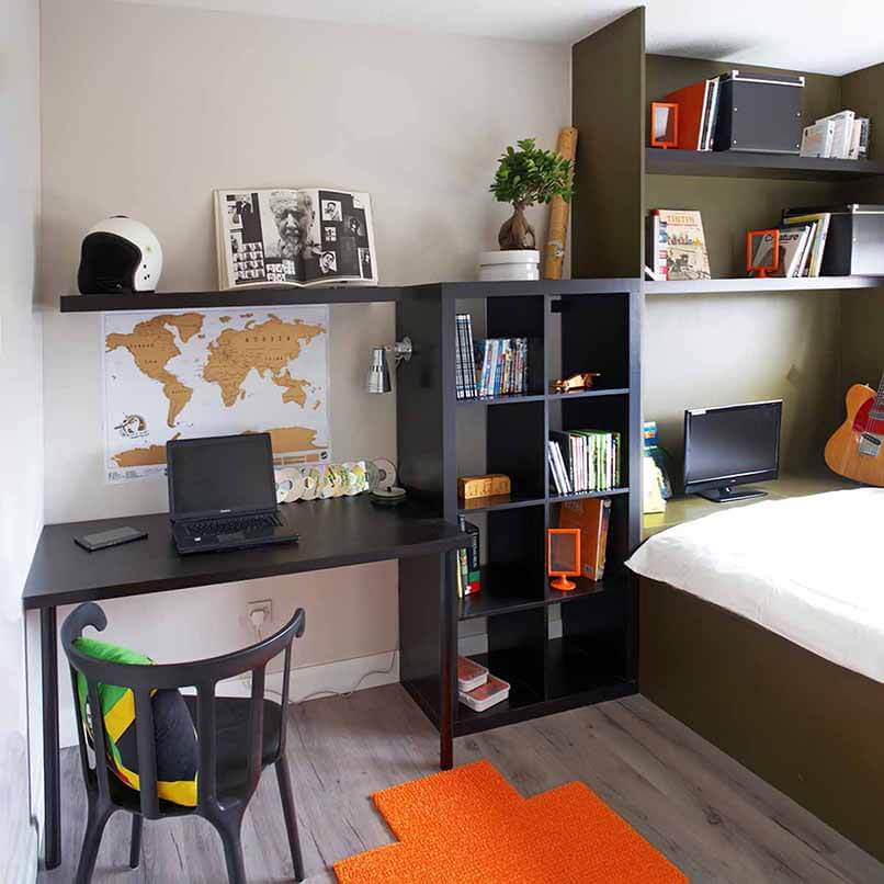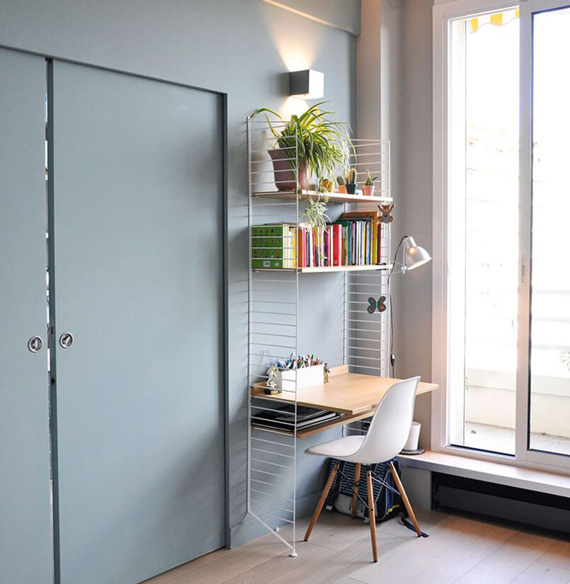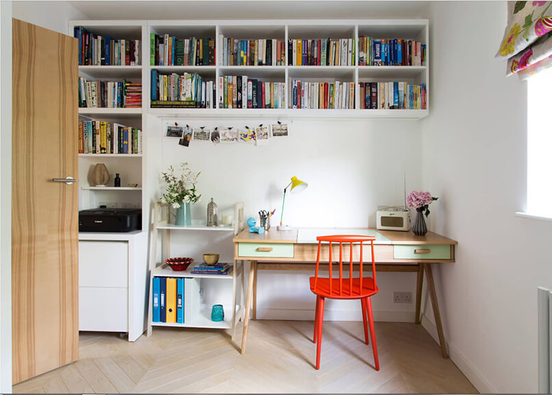 Một chiếc kệ sách sẽ làm giảm gánh nặng cho bàn học vì sách vở sẽ tìm được nơi chúng cần đặt. Và việc chọn kệ như thế nào thì phụ thuộc vào bố cục của không gian, cách bố trí phù hợp với người ngồi.