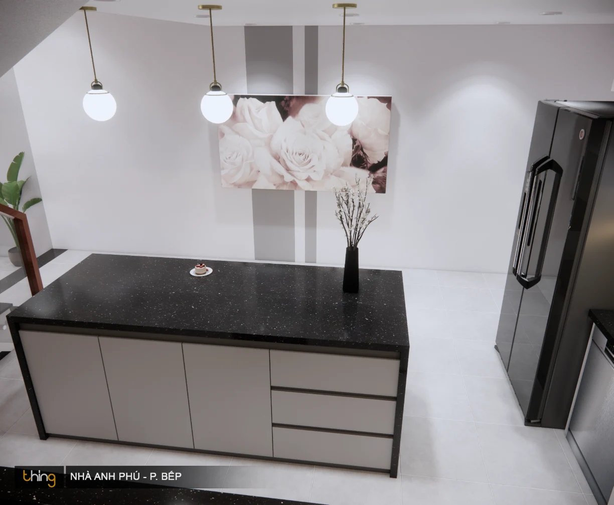 Mặt bàn đá của đảo bếp được làm bằng đá kim sa đen nên không thể phủ nhận được vẻ đẹp sang trọng.