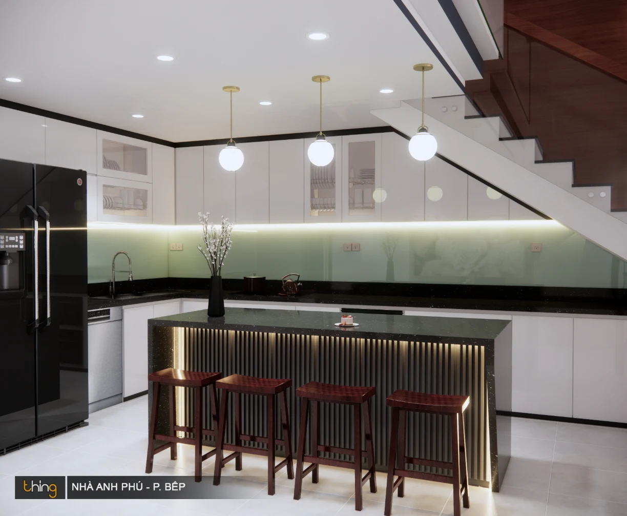 Cảm giác đầu tiên khi nhìn thấy thành phẩm khách bếp chính là “bling bling” (Phát sáng). Bởi hệ thống ánh sáng từ đèn led, đèn chùm được thiết kế vô cùng hài hoà từ kiểu đèn cho đến màu sắc.