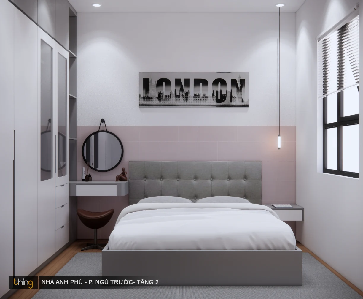 Có thể thấy được diện tích căn phòng không quá lớn nhưng tổng thể căn phòng được bố trí đâu vào đó. Những đồ nội thất như: tủ quần áo, bàn trang điểm, giường đều được thiết kế cùng một tone màu.