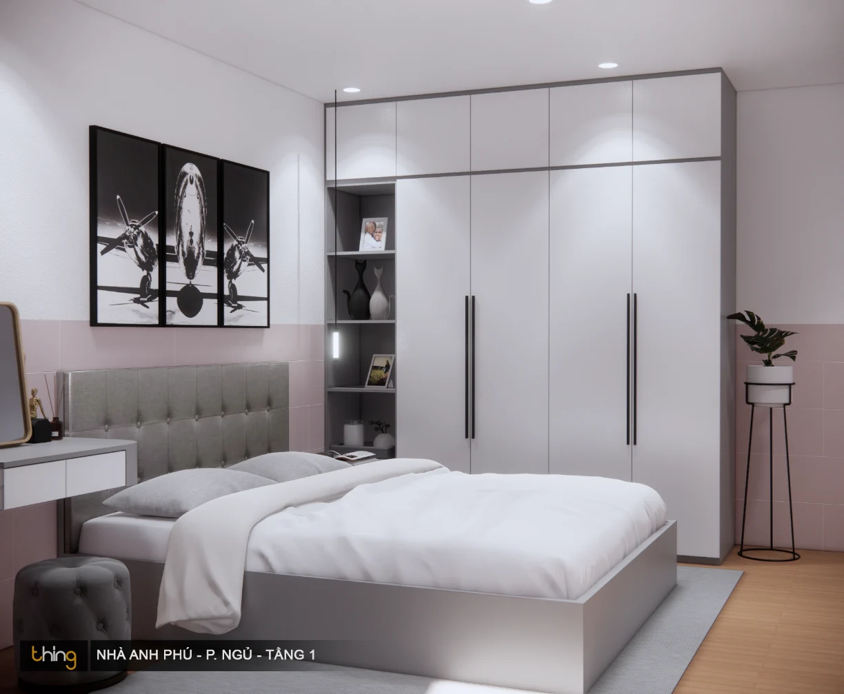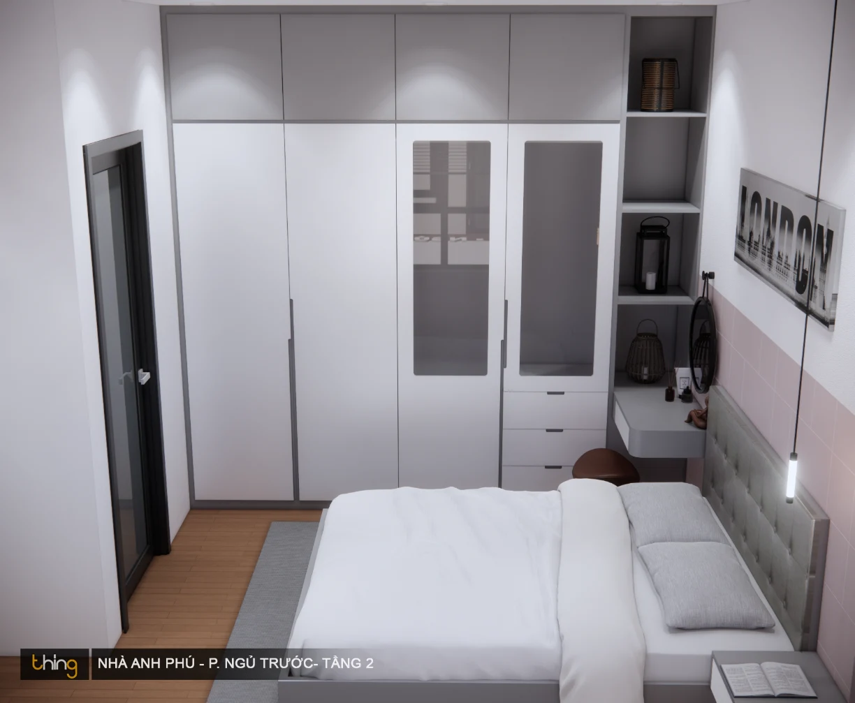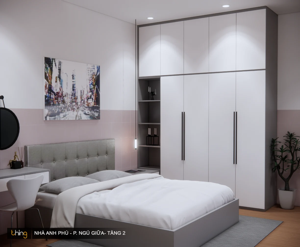 Căn phòng được thiết kế đúng kiểu hiện đại bởi hệ thống tủ quần áo kịch trần. Nó không chỉ tăng thêm diện tích sử dụng mà còn tạo cho không gian một cút “dư thừa” nào.