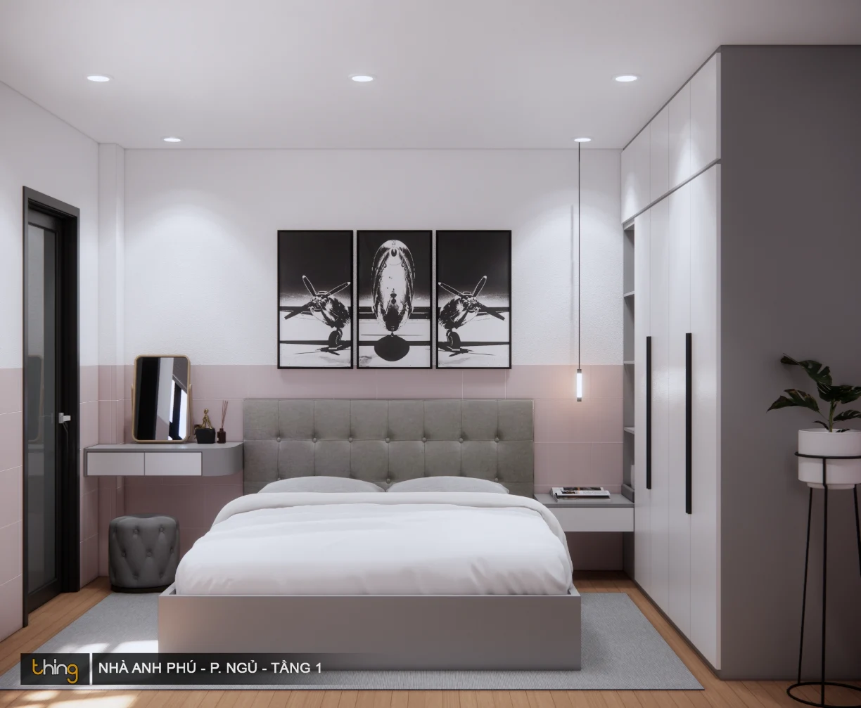 Phòng ngủ này được thiết kế theo phong cách hiện đại, tối giản nhất. Bởi tất cả những món đồ nội thất được bố trí trong không gian đều “vừa đủ” phục vụ nhu cầu sử dụng mà không có bất cứ một hành động dư thừa nào.