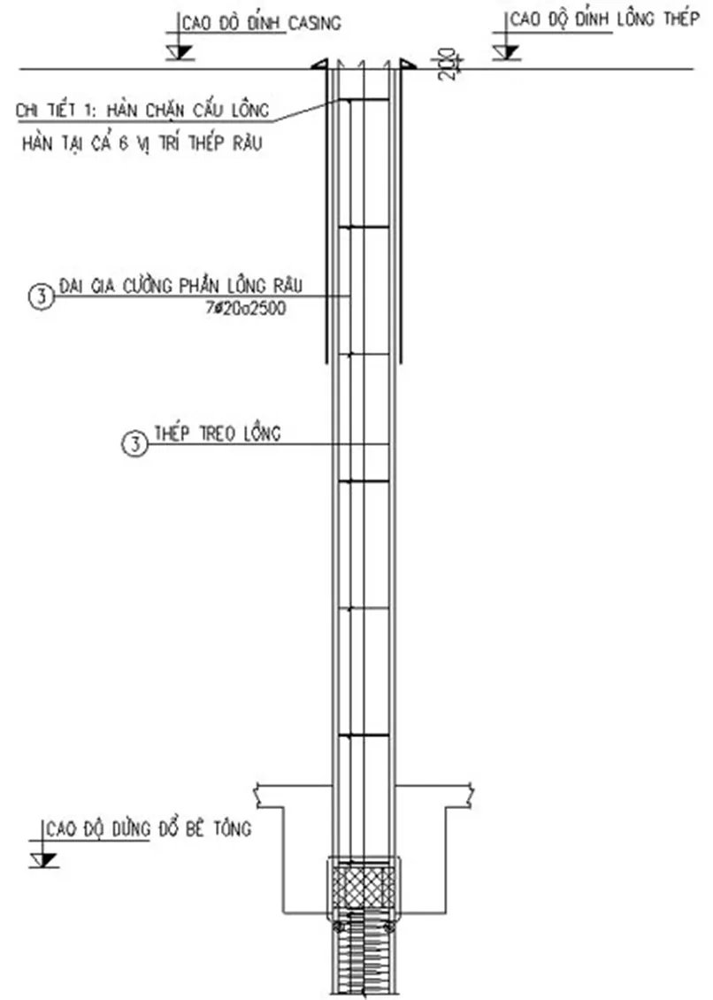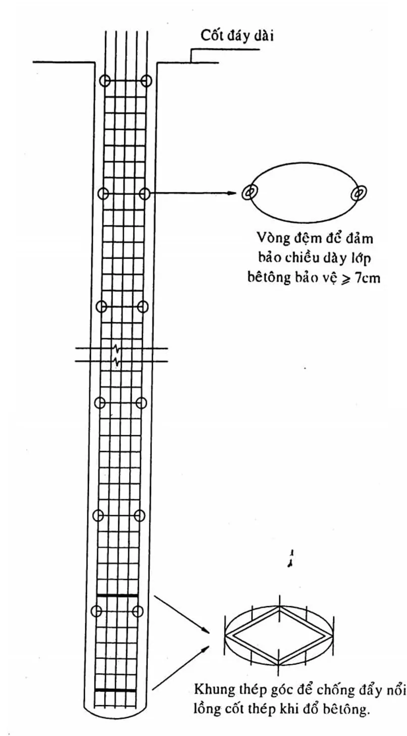 Để đảm bảo quá trình thi công cẩu lắp thuận tiện, lồng cốt thép được chế tạo thành từng đoạn. Các lồng thép được tổ hợp lại với nhau khi hạ lồng vào hố khoan. Thép chủ của lồng thép nối với nhau bằng 50% cóc nối và 50% nối buộc.