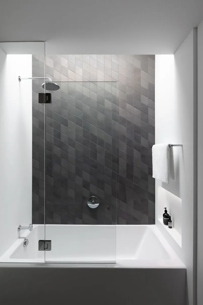 Một cách để giải quyết vấn đề là lắp đặt hai hốc tắm riêng biệt ở các độ cao khác nhau hoặc có một hốc tắm cao thẳng đứng có kệ đi kèm trong thiết kế.
