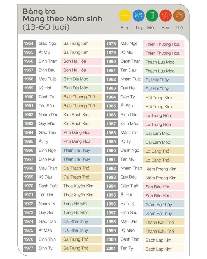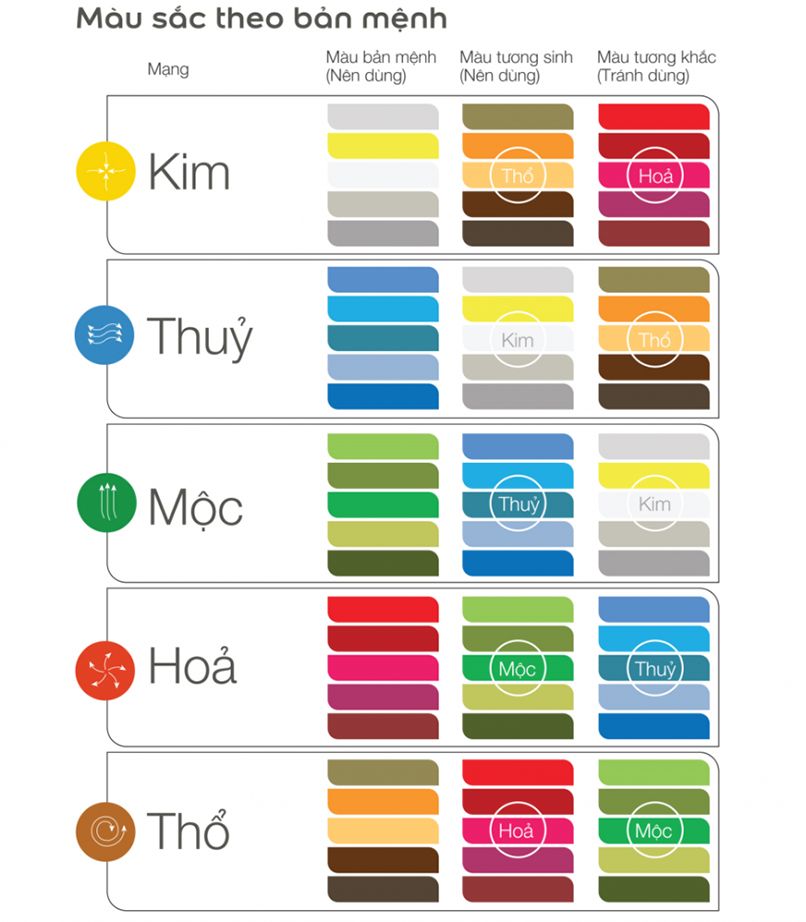 Trong ngũ hành có 5 yếu tố: Kim, Mộc, Thủy, Hỏa, Thổ. Mỗi một yếu tố sẽ có bảng màu riêng dành cho mình mà chúng vận động theo quy tắc vạn vật sinh ra đều chịu ảnh hưởng.