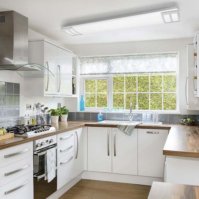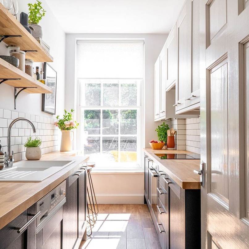 - Cửa sổ phòng bếp nên được đặt cao ngang với tủ bếp dưới hoặc bàn bếp trở lên.