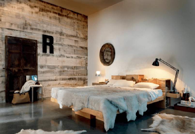 - Trang trí phòng ngủ Vintage với gỗ tái chế. Tủ đầu giường hay ghế bench cuối giường đều sử dụng những thanh gỗ ghép tái chế giữ được màu sắc xưa cũ.