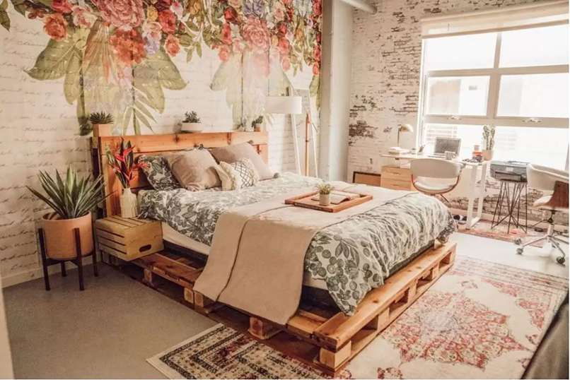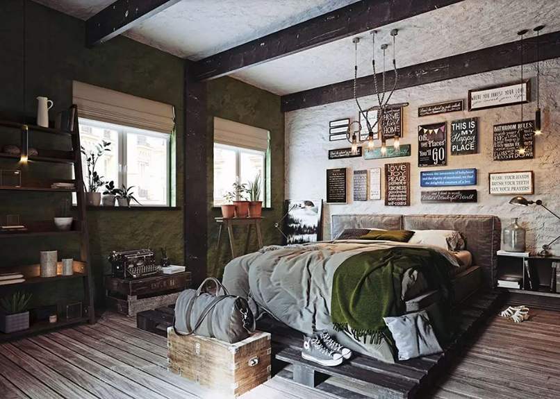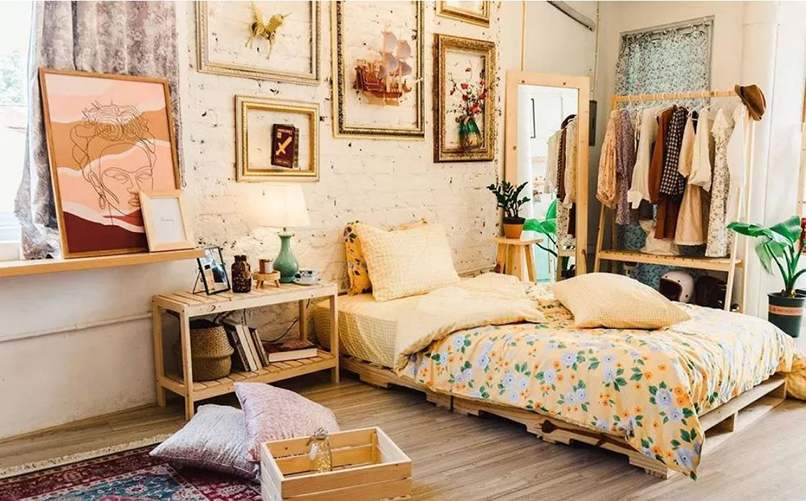 - Trang trí phòng ngủ bằng giường pallet. Giường pallet gỗ là lựa chọn hợp lý khi trang trí theo phong cách Vintage. Thiết kế đơn giản, dễ tháo lắp và giá thành rất rẻ.
