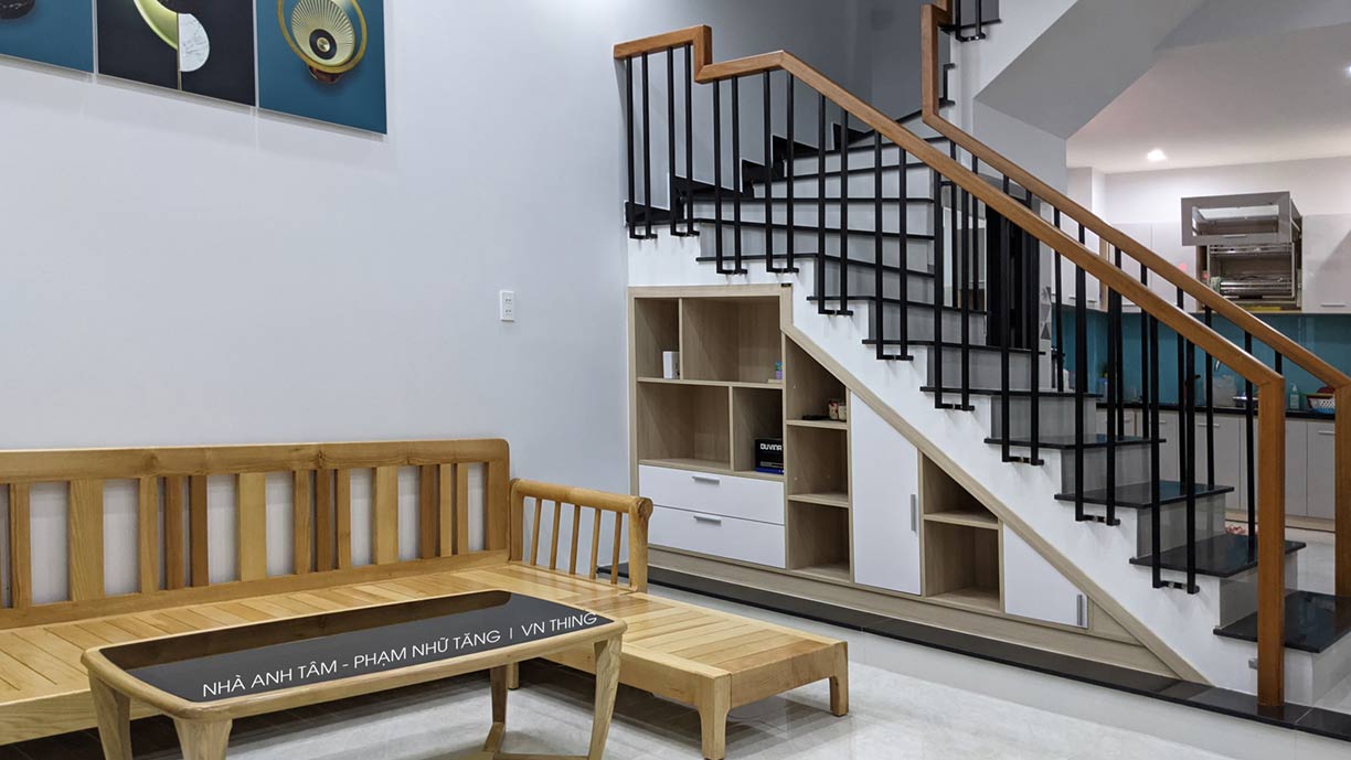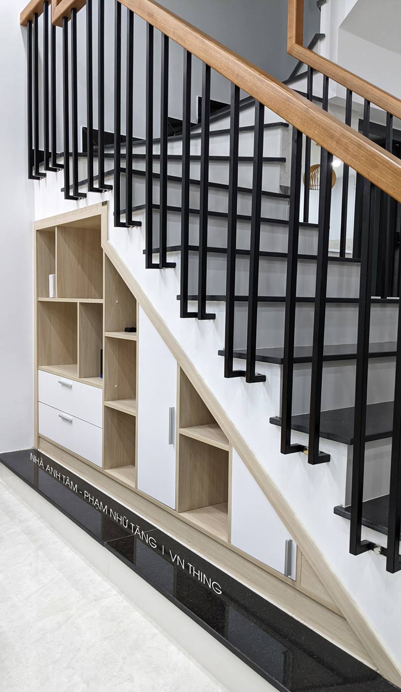 Tủ chân cầu thang để tận dụng khoảng trống. Vừa đẹp vừa hữu ích.