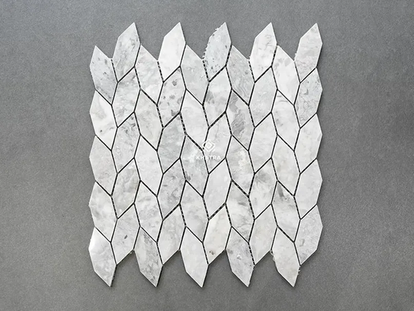 - Gạch mosaic hình lông vũ: Mặc dù tên lông vũ nhưng thực tế thì chúng giống hình chiếc lá hay hình dẻ quạt thon dài.