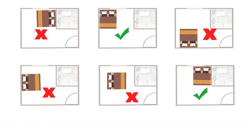 Thứ nhất, kê giường ngủ đối diện nhà vệ sinh. Nhà vệ sinh là nơi tích tụ nhiều năng lượng xấu, có hại và nhiều vi khuẩn, nấm mốc nên ảnh hưởng đến sức khỏe người ngủ. Vì thế bạn nên kê giường lệch hướng với nhà vệ sinh và đóng cửa nhà vệ sinh để không ảnh hưởng đến giấc ngủ.