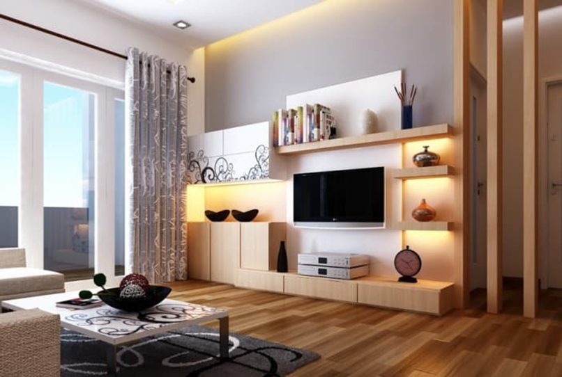 - Thiết kế hốc âm tường phòng khách bằng kệ đơn giản