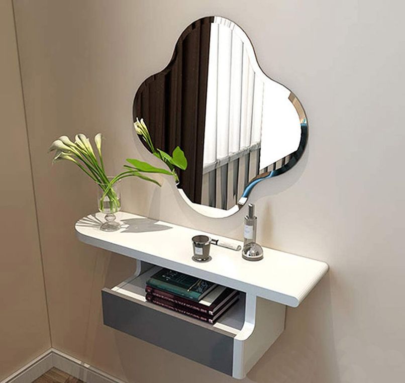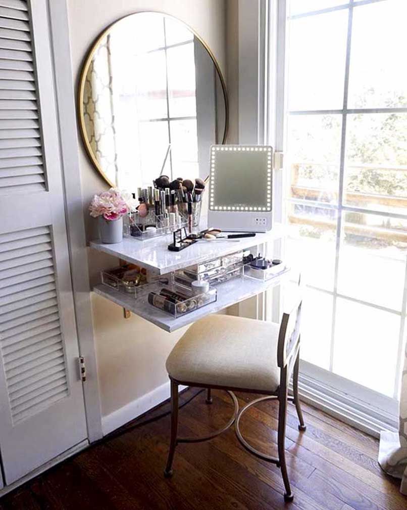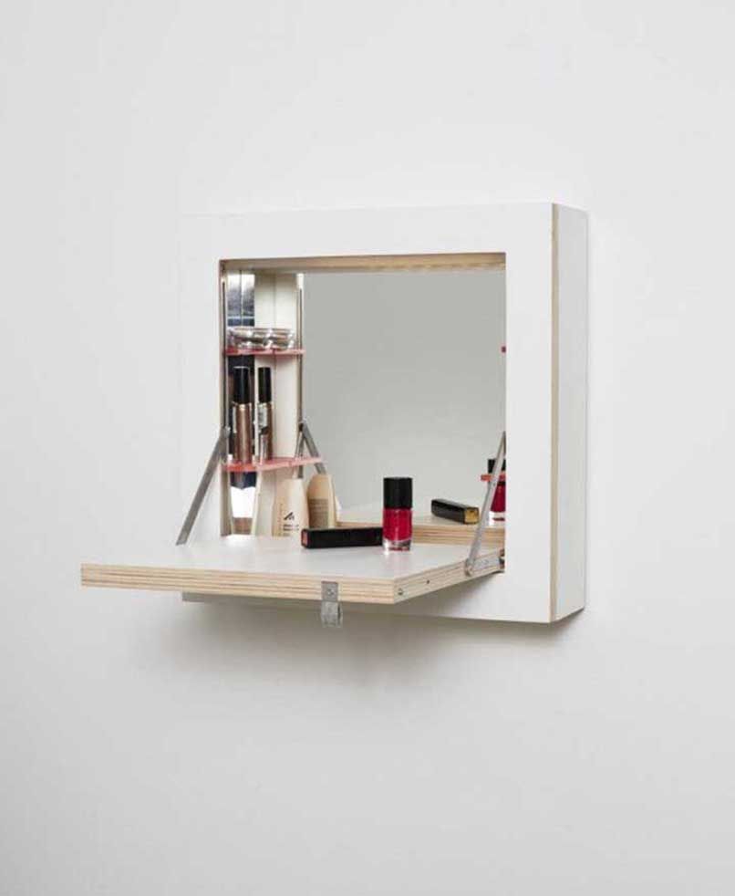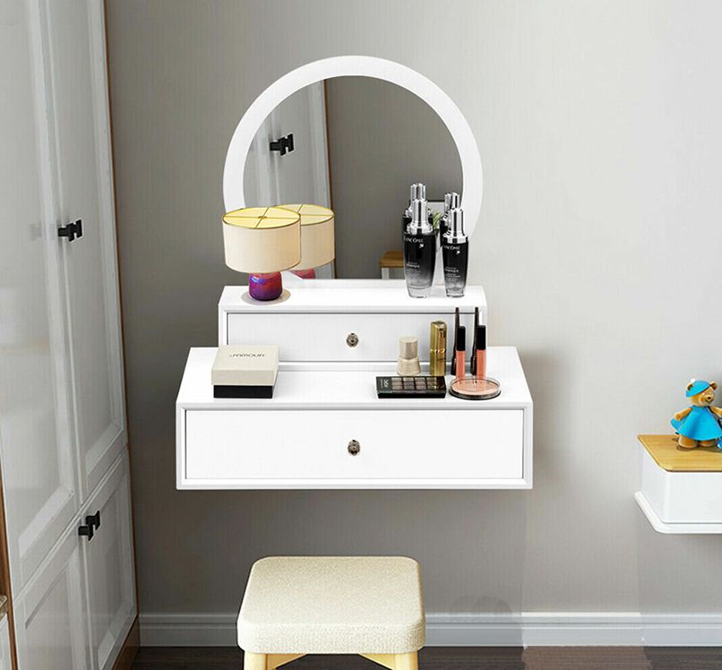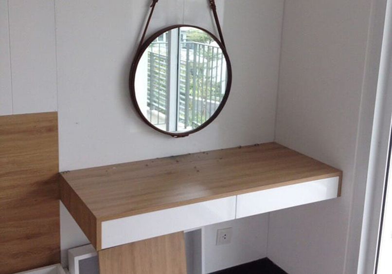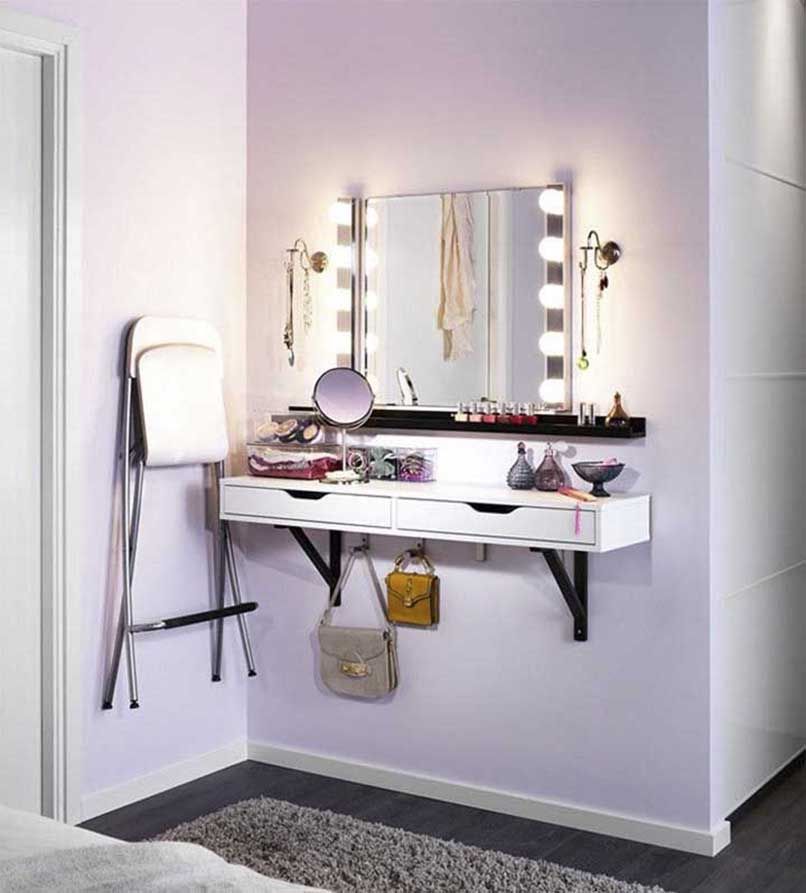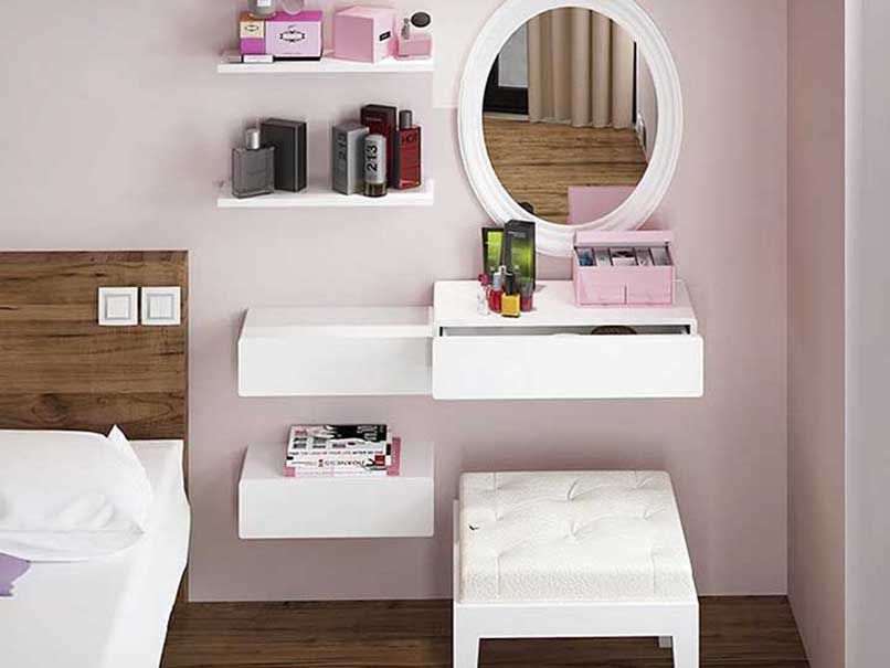 Đối với những căn phòng có diện tích từ 35m2 trở xuống cần ưu tiên các nội thất thiết yếu như giường, tủ,… thì nên chọn một sản phẩm bàn trang điểm nhỏ gọn, có thiết kế thông minh như bàn trang điểm treo tường.