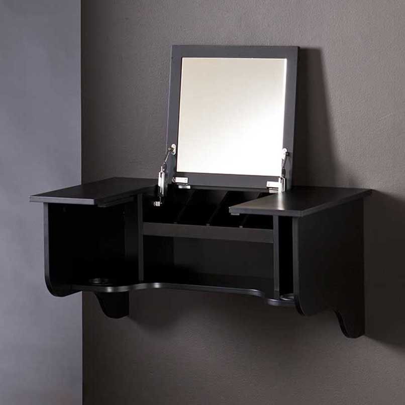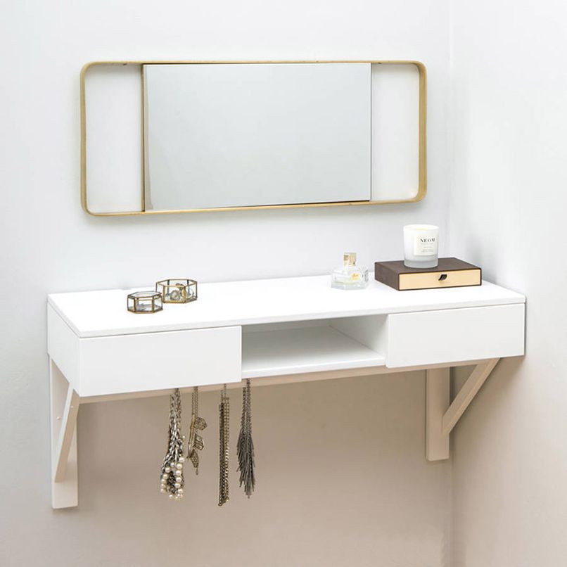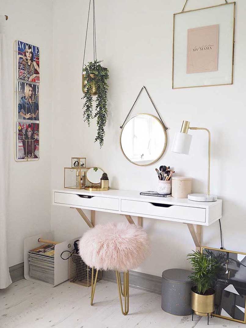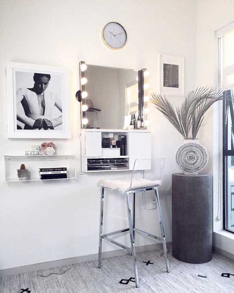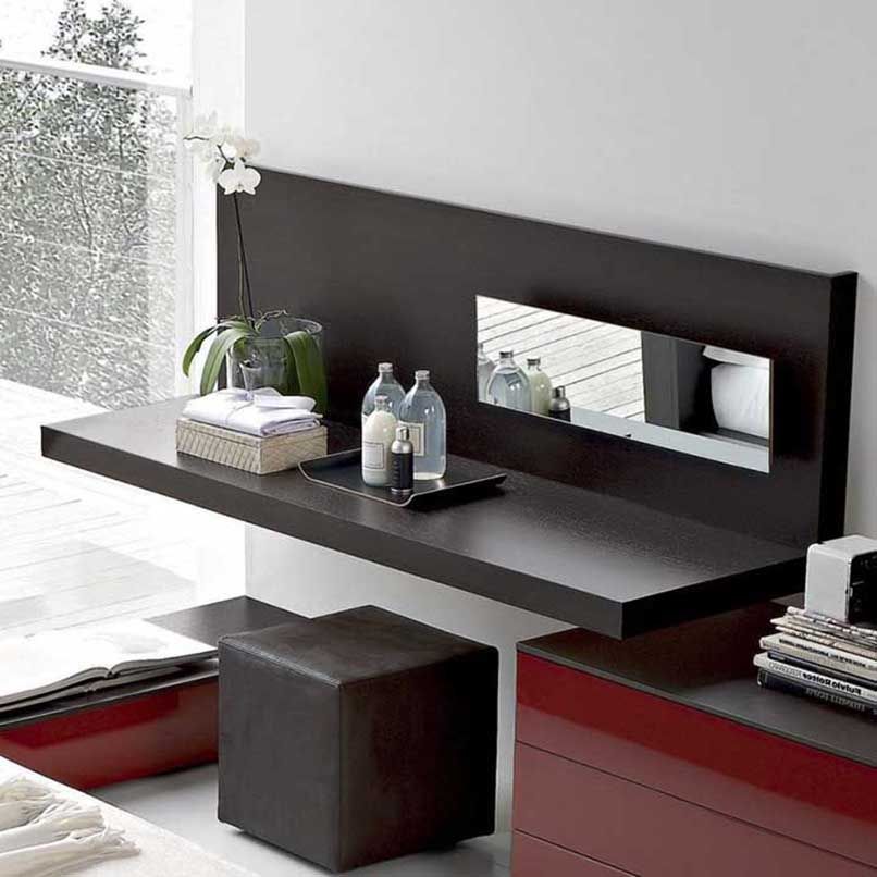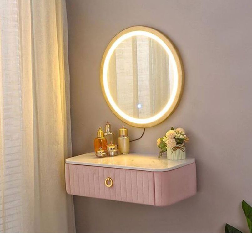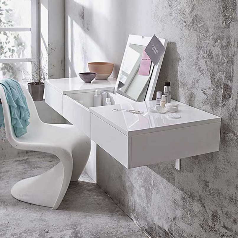 Đối với những căn phòng có diện tích từ 35m2 trở xuống cần ưu tiên các nội thất thiết yếu như giường, tủ,… thì nên chọn một sản phẩm bàn trang điểm nhỏ gọn, có thiết kế thông minh như bàn trang điểm treo tường.