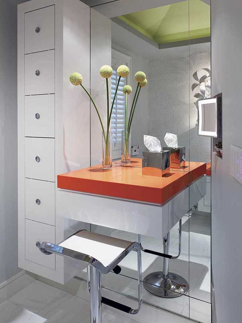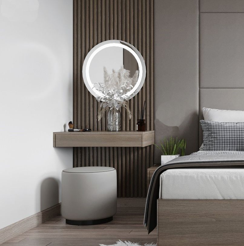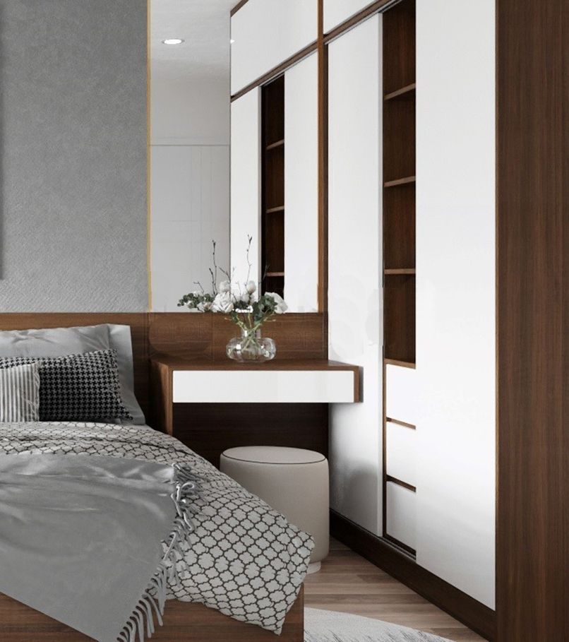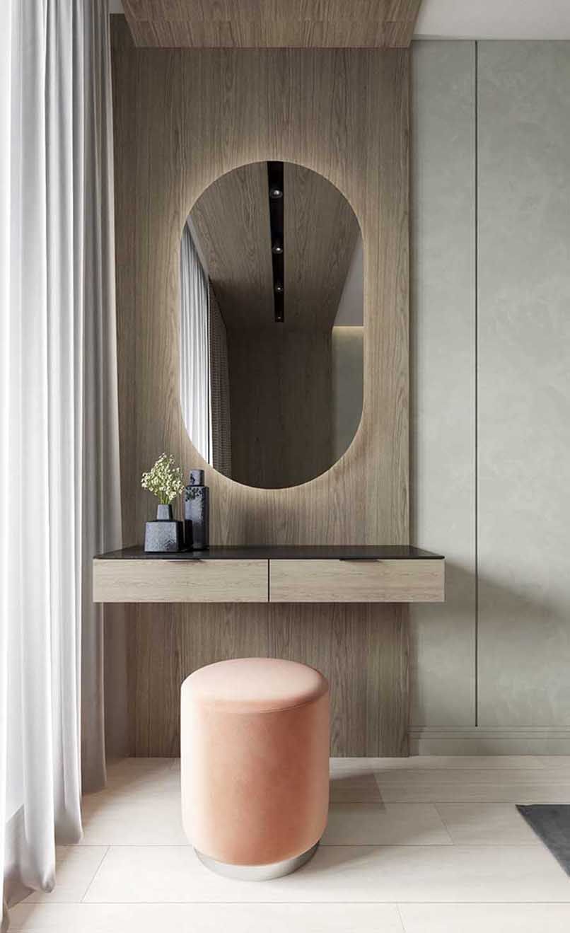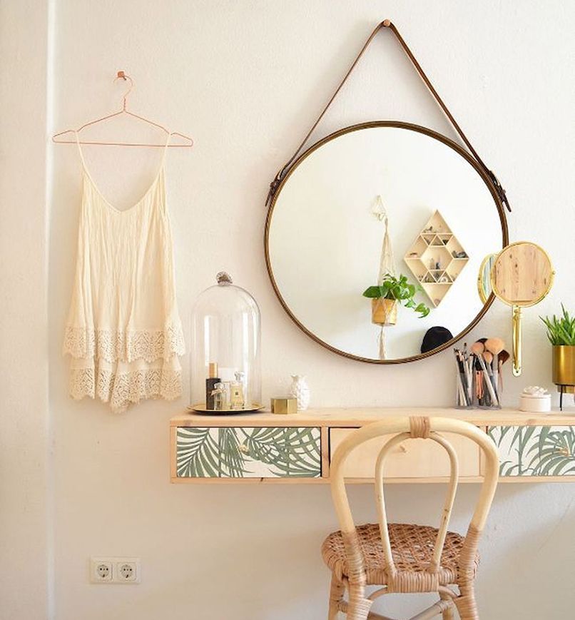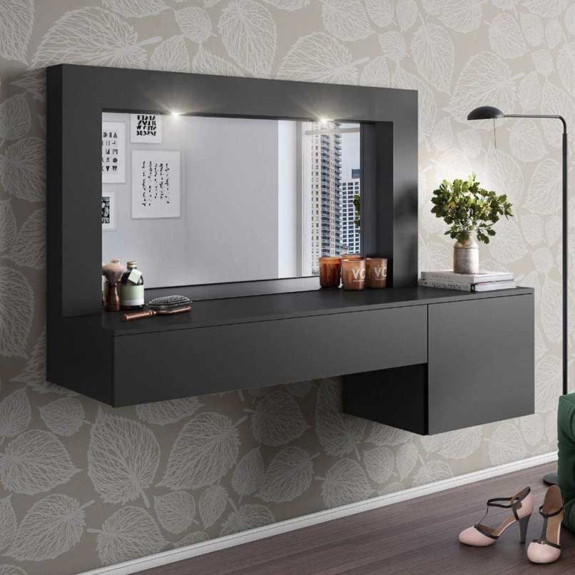 Đối với những căn phòng có diện tích từ 35m2 trở xuống cần ưu tiên các nội thất thiết yếu như giường, tủ,… thì nên chọn một sản phẩm bàn trang điểm nhỏ gọn, có thiết kế thông minh như bàn trang điểm treo tường.