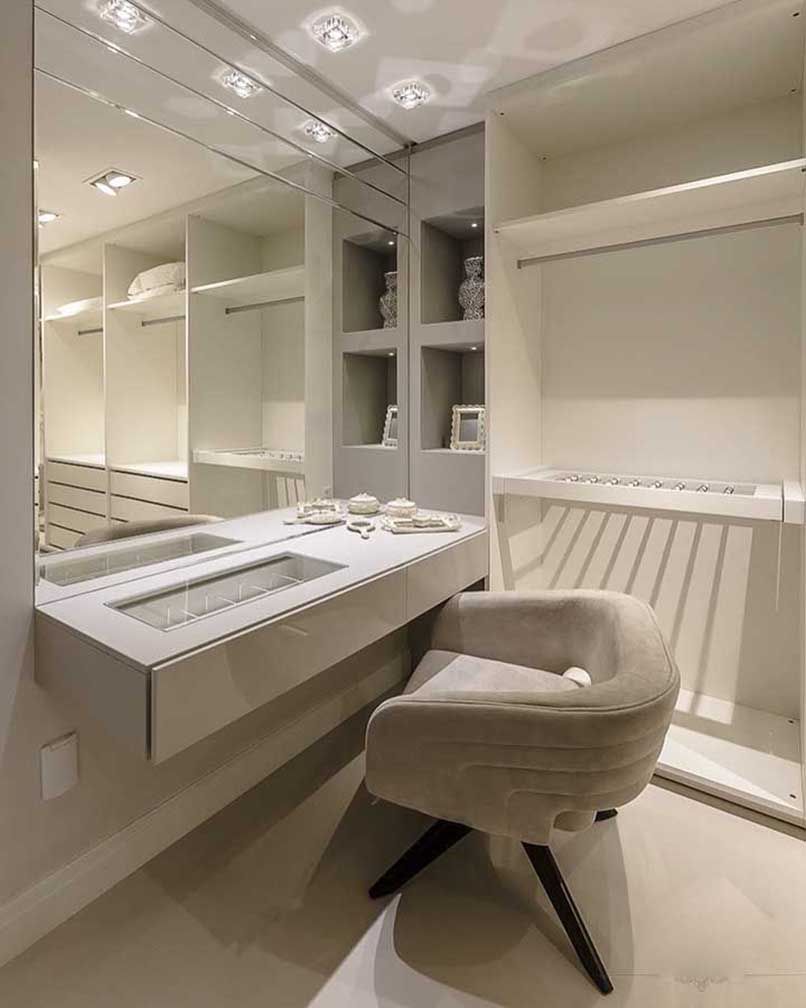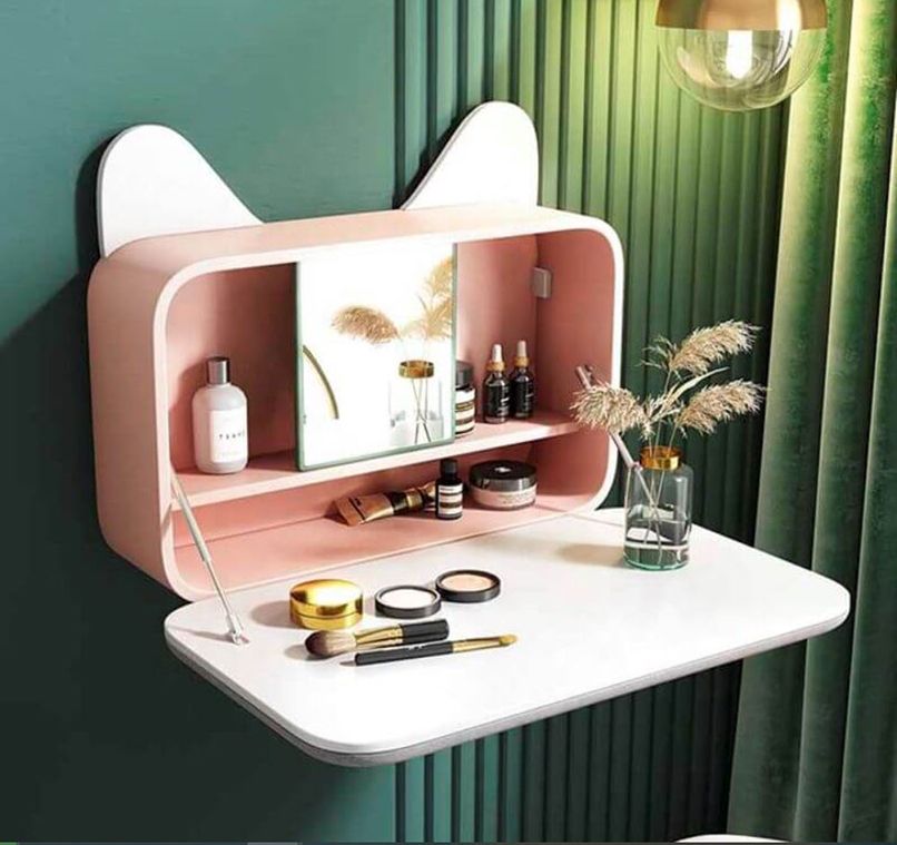 Thứ ba, có thể tích hợp bàn làm việc. Nhu cầu làm việc và làm đẹp của phụ nữ hiện nay luôn đi liền với nhau. Nên những thiết kế kệ trang điểm treo tường đẹp có thể tận dụng làm bàn làm việc lại có thể tiết kiệm không gian.