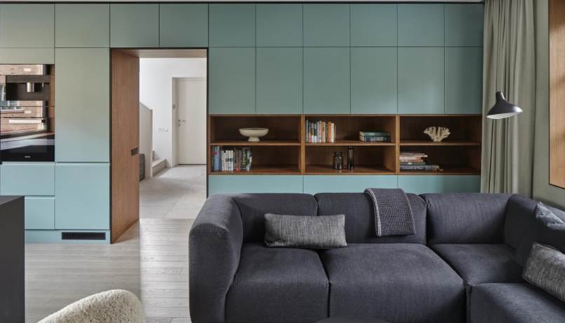 Thứ hai, phân chia không gian. Đối với những không gian thông nhau giữa phòng bếp và khách thì một chiếc tủ tường phân chia không gian là hợp lý thay vì vách ngăn bức bối.