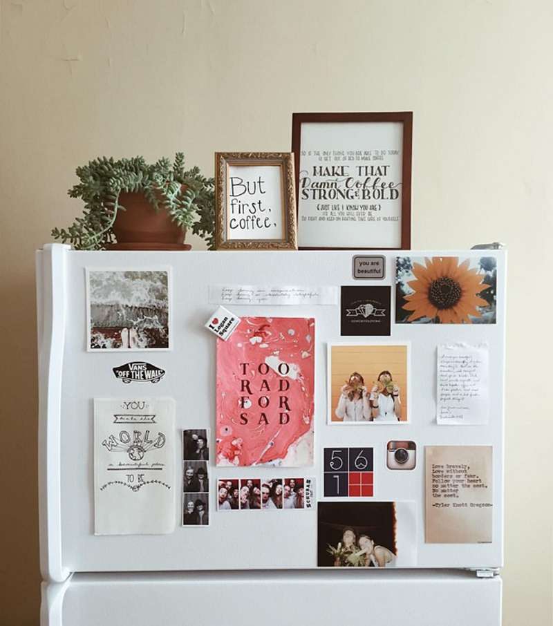 Mỗi một tấm ảnh khi được sắp xếp theo một bố cục hợp lý, nó sẽ làm tủ lạnh trở nên đẹp và ý nghĩa hơn hẳn. Tuy nhiên nó có một bất lợi là các vết kéo dính trên tủ sau khi dọn dẹp.