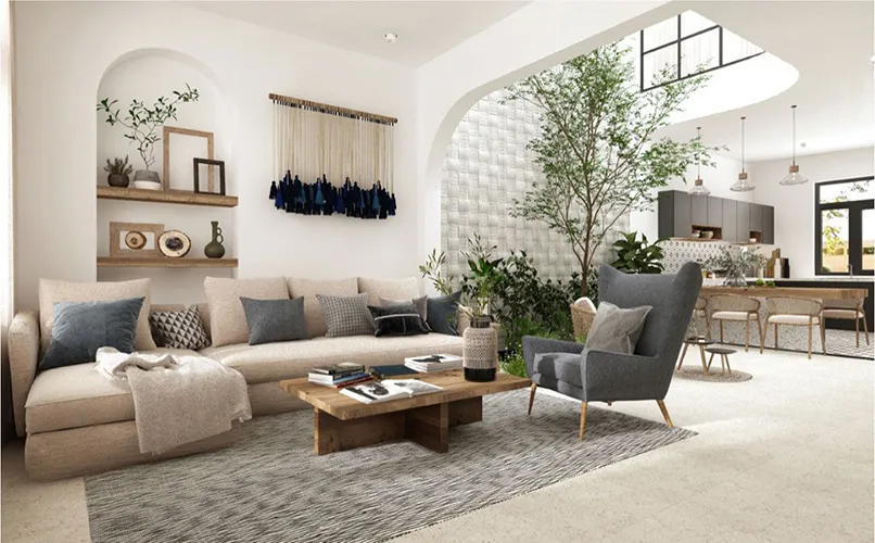 Những vật liệu dùng để bố trí trong phong cách này cũng được ứng dụng từ các vật liệu: gạch khảm, đá cẩm thạch, gỗ tự nhiên, tre, nứa,…