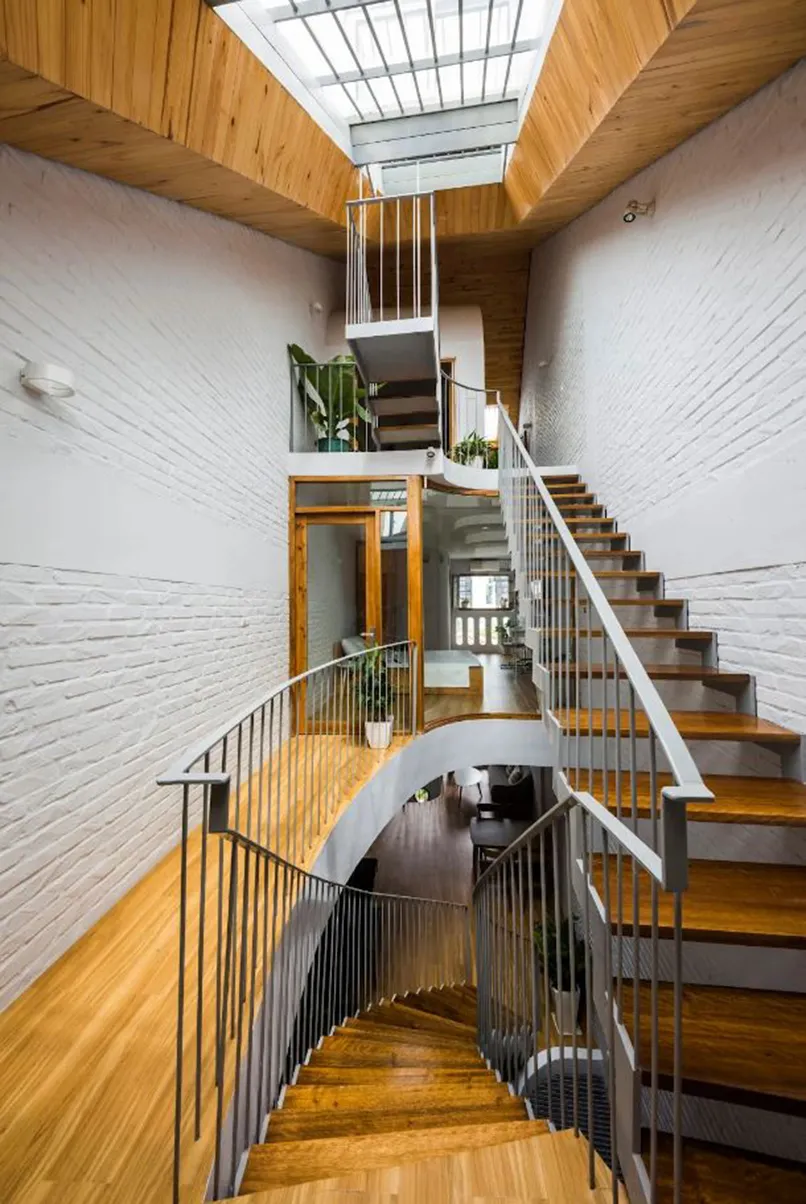 Kiểu nhà này thông thường có cầu thang đặt giữa nhà, thường có 2-3 phòng bao quanh. Thiết kế này được đánh giá là một trong những kiểu kiến trúc độc đáo khi nhìn từ trên xuống. Nó tận dụng tối đa phần không gian ở khu vực cầu thang trở thành giếng trời lấy sáng, lấy gió cho toàn bộ không gian.