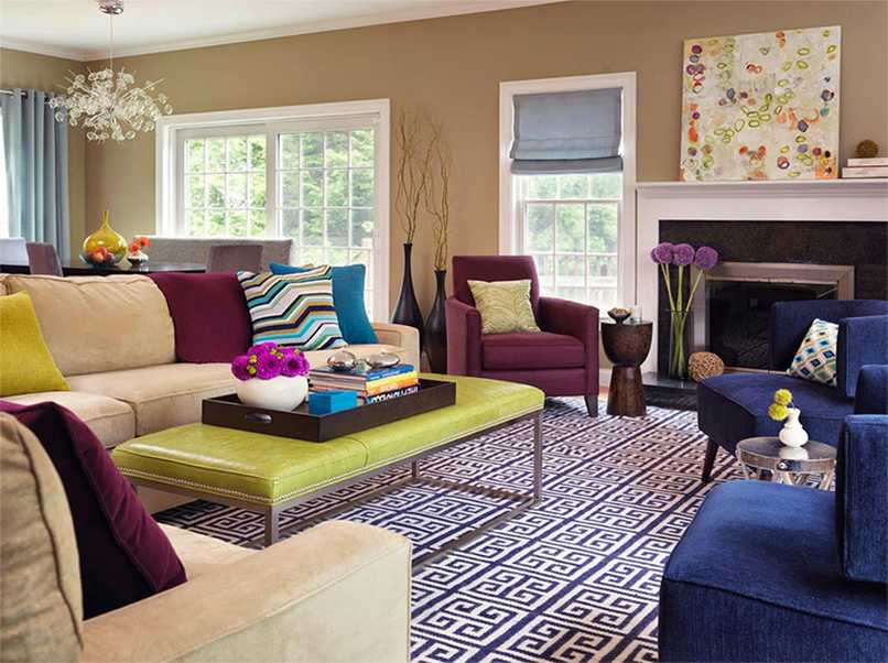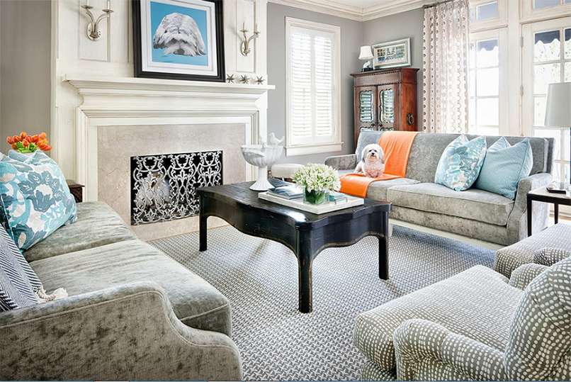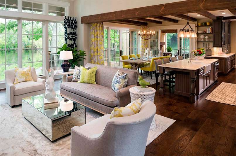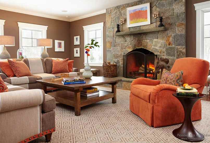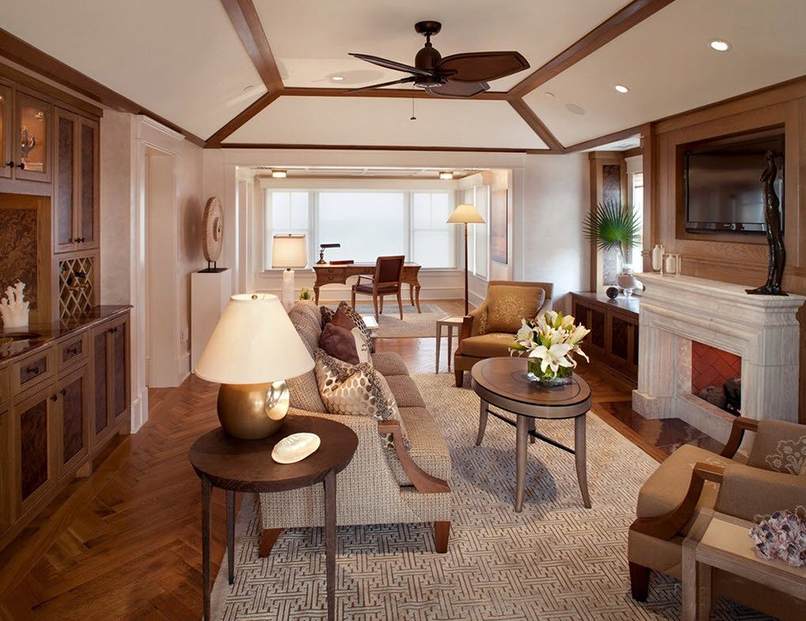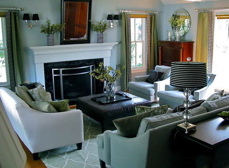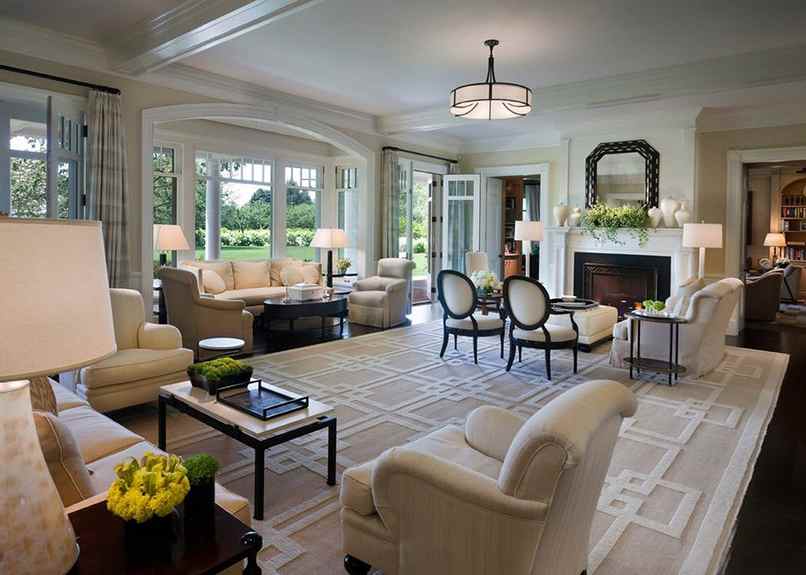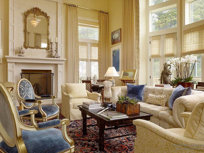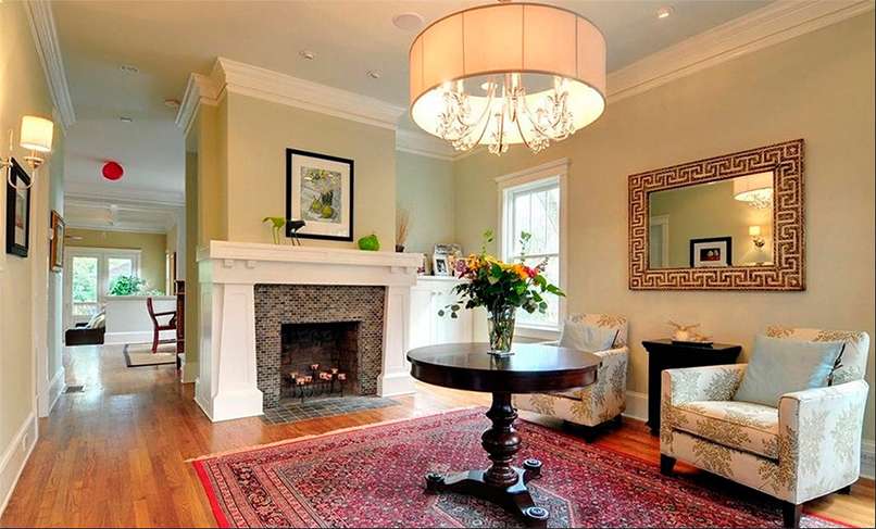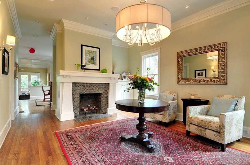 - Phòng khách được trang trí với lò sưởi, bao phủ bằng gạch có hoa văn hoặc gạch đơn sắc.