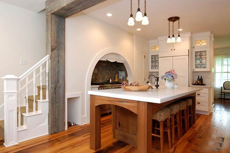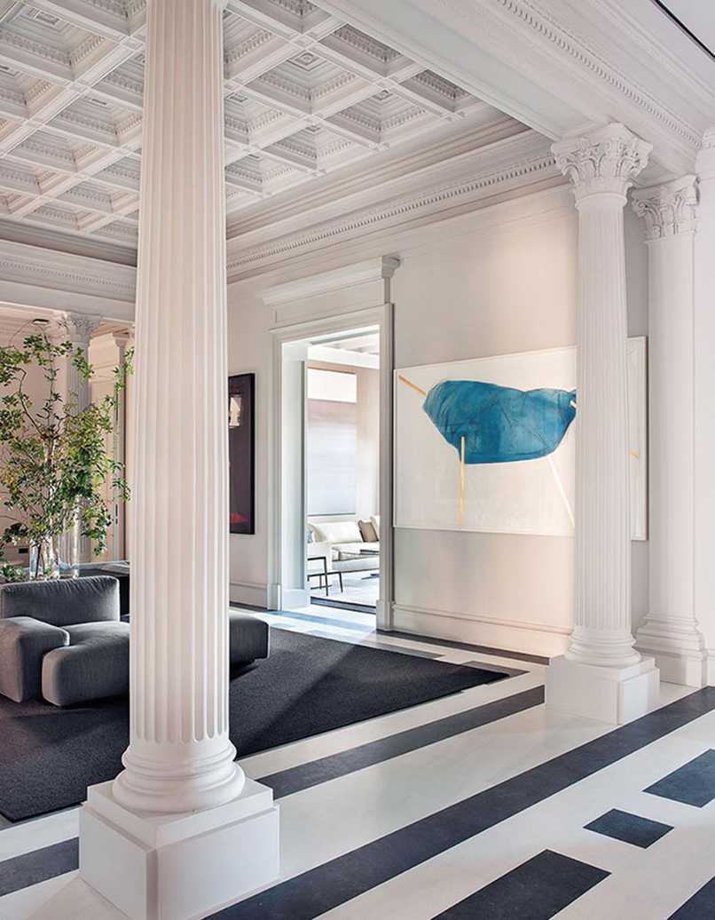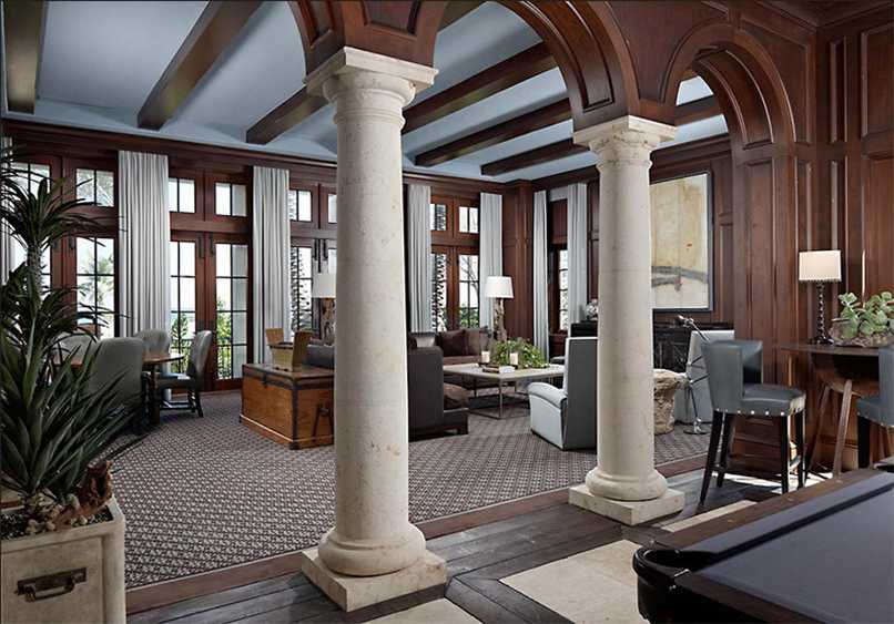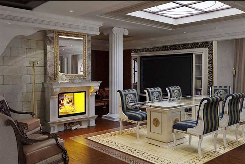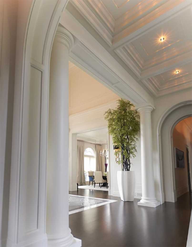 - Căn phòng rộng rãi được trang trí với các cột polyurethane màu trắng với nhiều lớp sơn như màu be, trắng. Thêm sự ấn tượng vào đó là một viên đá tự nhiên hoặc đá cẩm thạch.
