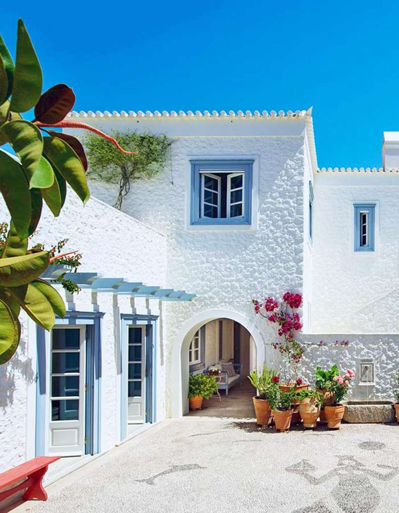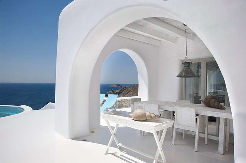 Cuối cùng, thiết kế sân vườn. Đây là một phần không thể thiếu của các ngôi nhà theo phong cách Nội thất Hy Lạp. Không gian ngoài trời với những bức tường trắng và nứt tự nhiên đan xen với đó là cây xanh.