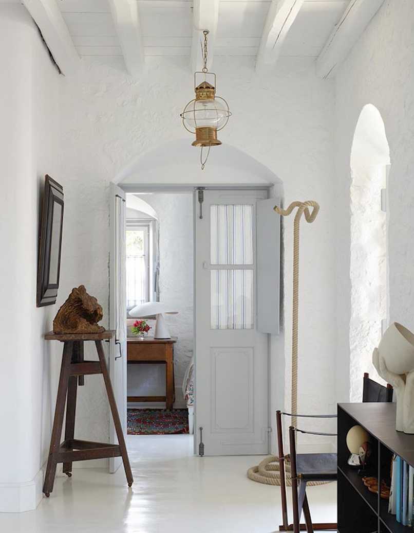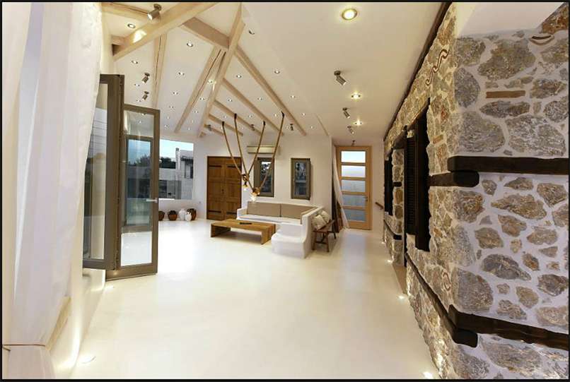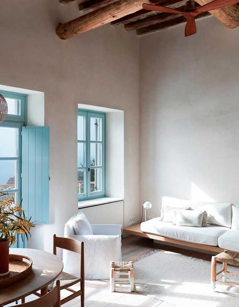 Thứ tư, thiết kế trần. Với lối thiết kế đơn giản không cần trang trí. Nó phù hợp với các phòng nhỏ và tăng diện tích trực quan bởi trần luôn là màu trắng. Nhưng đối với phong cách Hy Lạp hiện đại thì trần được trang trí bằng dầm gỗ.