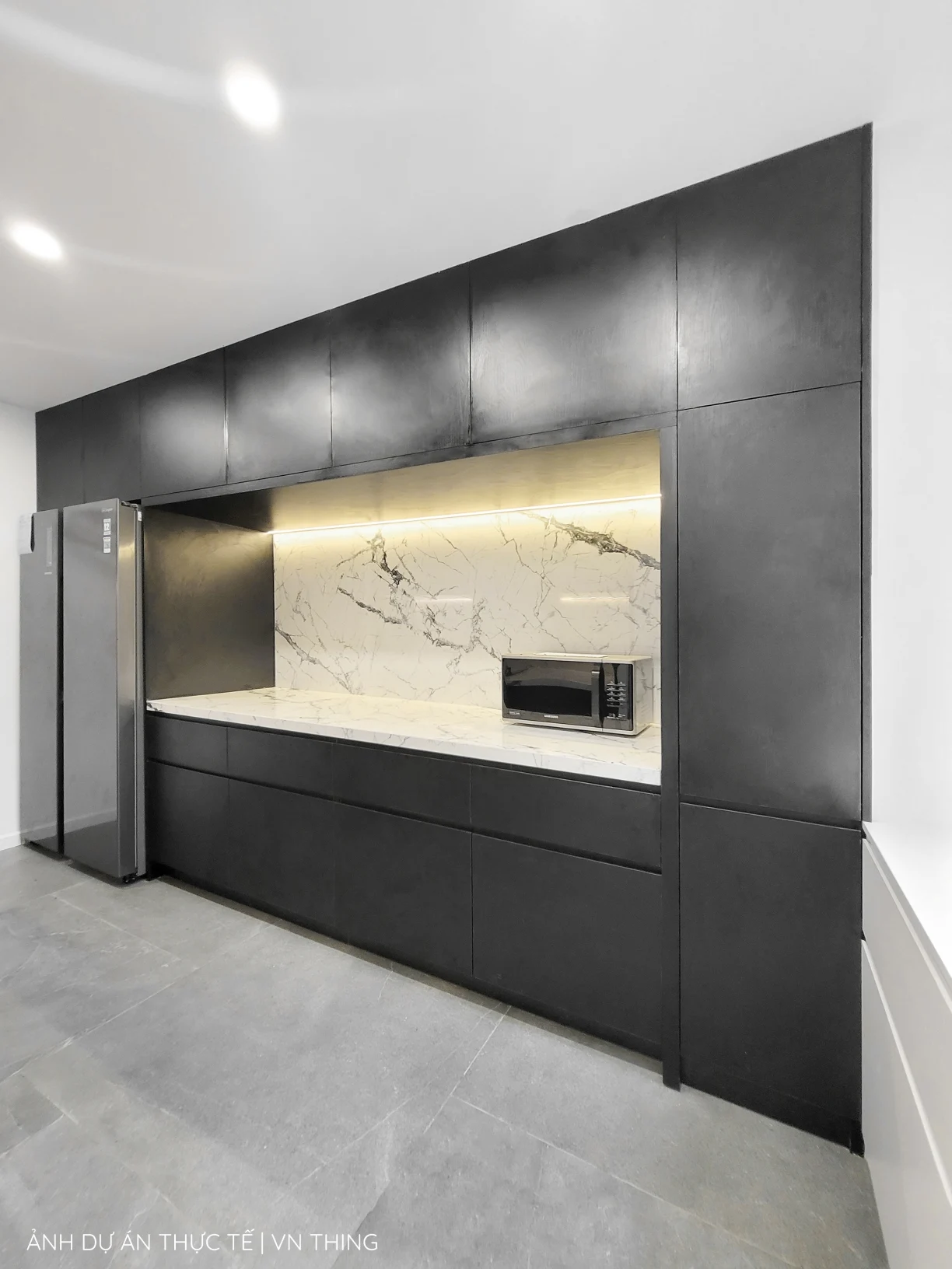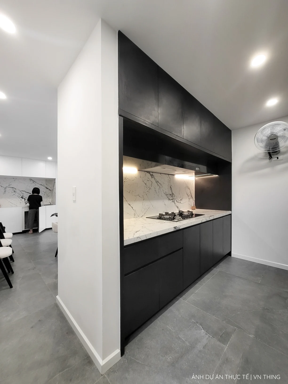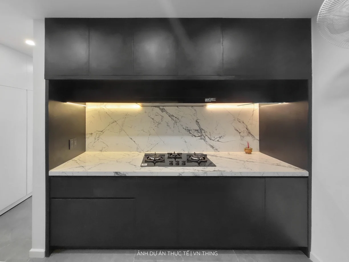 Được phủ lớp Melamine màu đen nổi bật, cùng sự bổ sung của đá vân mây, 2 chiếc tủ bếp này đại diện cho sự kết hợp hài hòa giữa thiết kế hiện đại và nét quyến rũ tự nhiên.