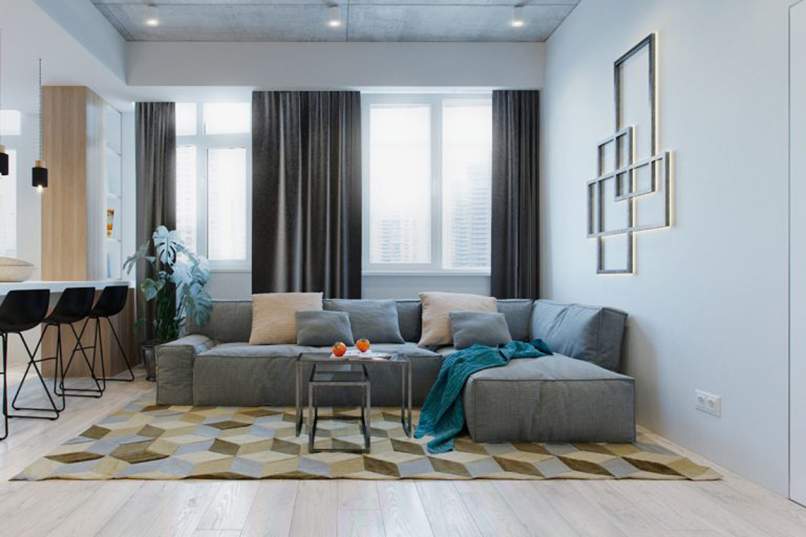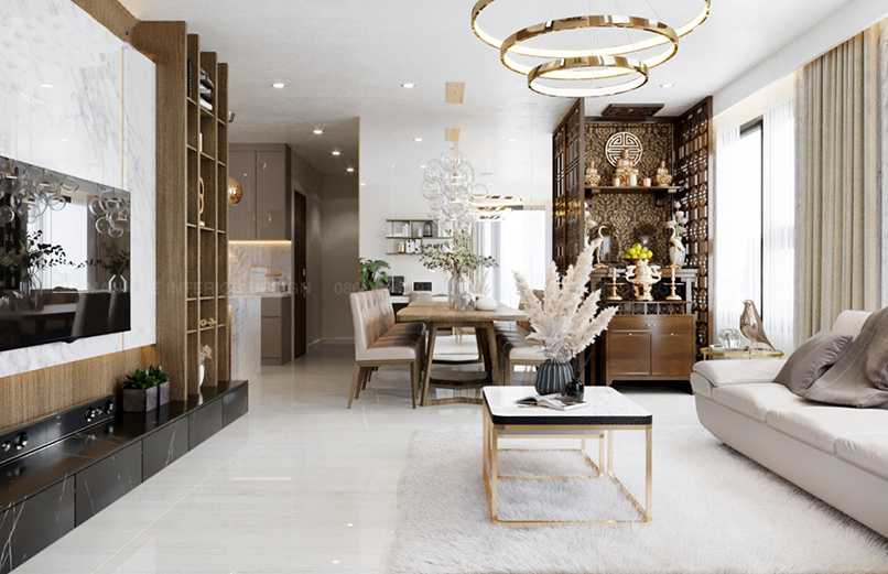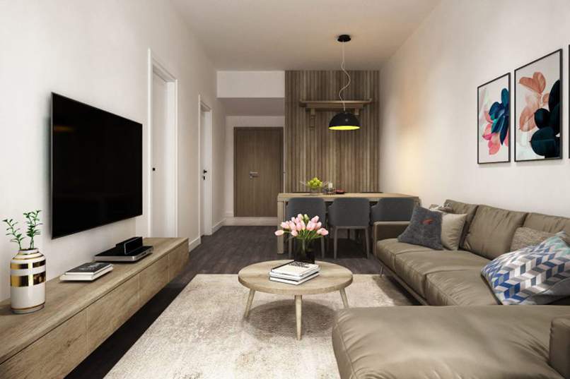 - Phối cảnh nội thất phòng khách căn hộ: Việc thiết kế này ưu tiên các sản phẩm thông thoáng và thoải mái.