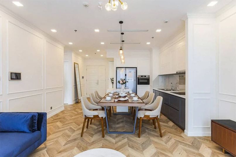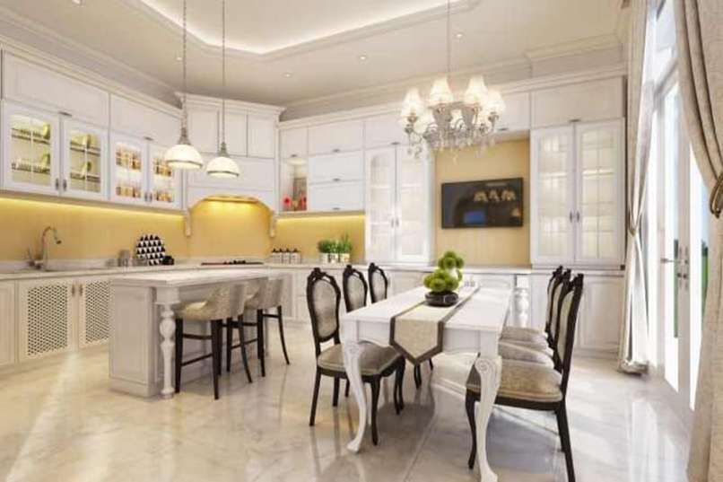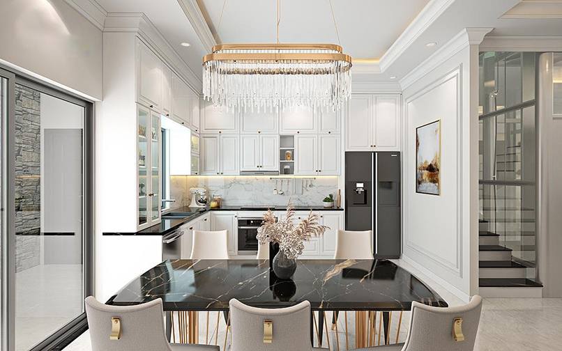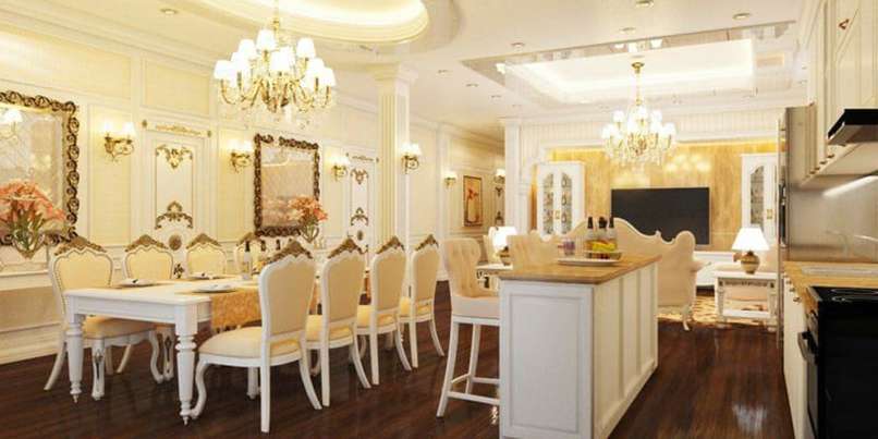 Đối với phòng ăn. Phòng ăn là một nơi vô cùng quan trọng vì đó là nơi gia đình có thể cùng bên nhau để tạo nên không khí ấm áp. Đối với Phong cách bán cổ điển, gia chủ chỉ cần sắp xếp lại những chiếc bàn ăn dài với vô số hoa văn đi cùng đẹp mắt. Phía trên đó là một cái đèn thả trần mang cùng phong cách là ngay lập tức bạn đã sở hữu một không gian gia đình ấm áp.