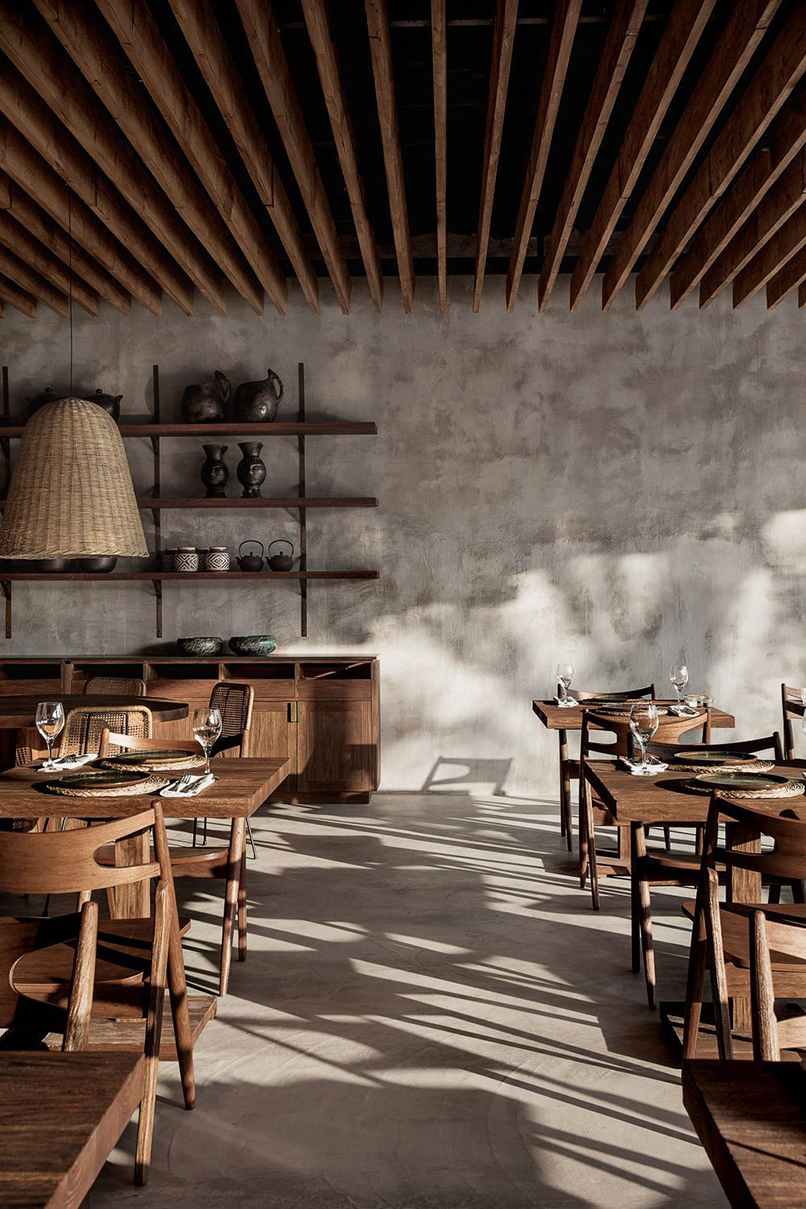 Khi áp dụng vào không gian thì những nguyên liệu này đều giữ nguyên trạng mà không có sự can thiệp làm nhẵn bề mặt. Những nội thất có thể kể đến như mặt bàn bằng đá, kệ bếp bằng bê tông…