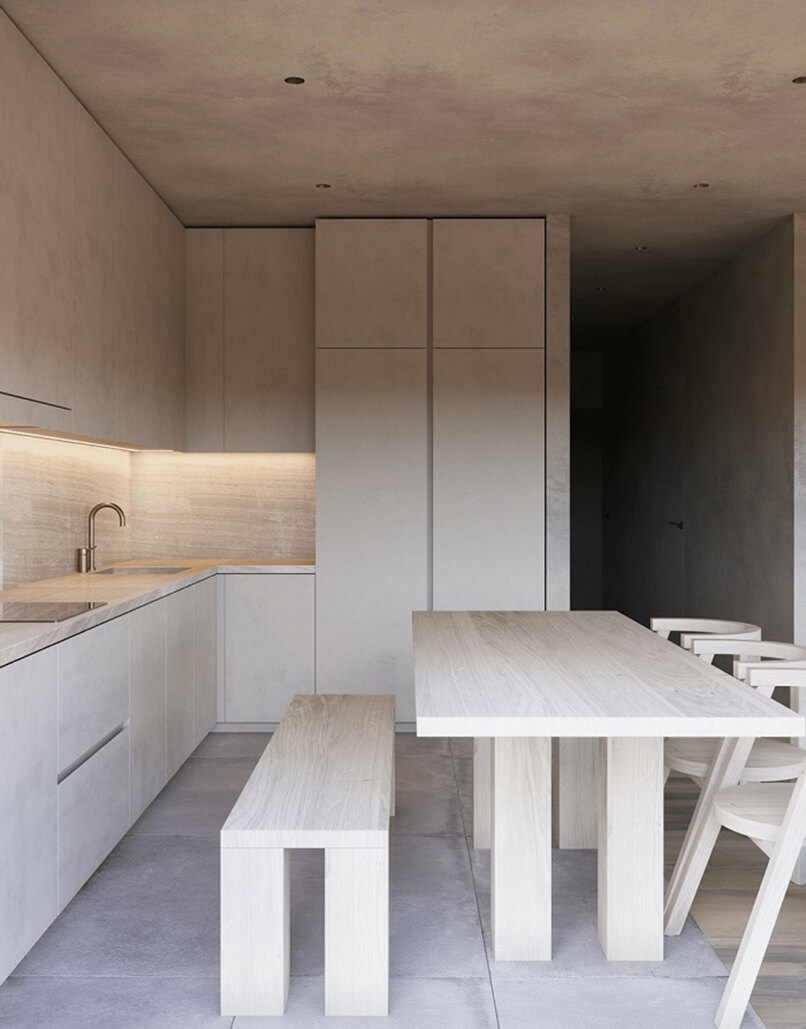 Thiết kế theo phong cách này mang đến sự bình yên, thinh lặng trong không gian thiếu vắng về vật chất. Chính vì vậy, những khoảng không đóng vai trò vô cùng quan trọng trong không gian này. Nó kết nối các nguồn sáng để tạo điểm nhìn sao cho các khoảng không tồn tại với một mục đích đó.