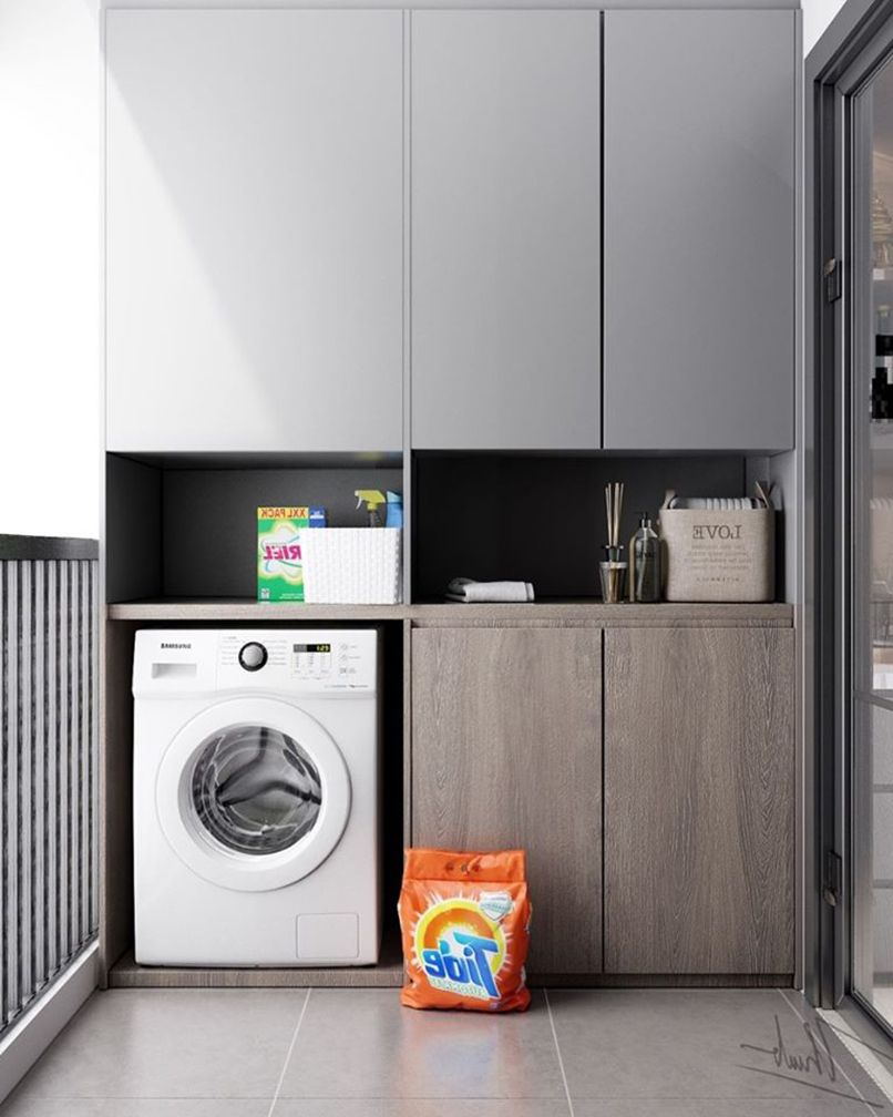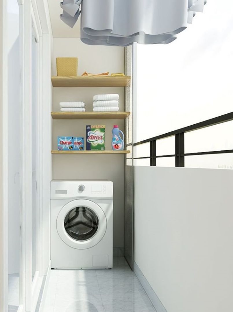 Thứ tư, bố trí phòng giặt đồ đẹp ở ban công. Ý tưởng này thường được ứng dụng nhiều trong các căn hộ chung cư, nhà phố nhỏ để tiết kiệm diện tích.
