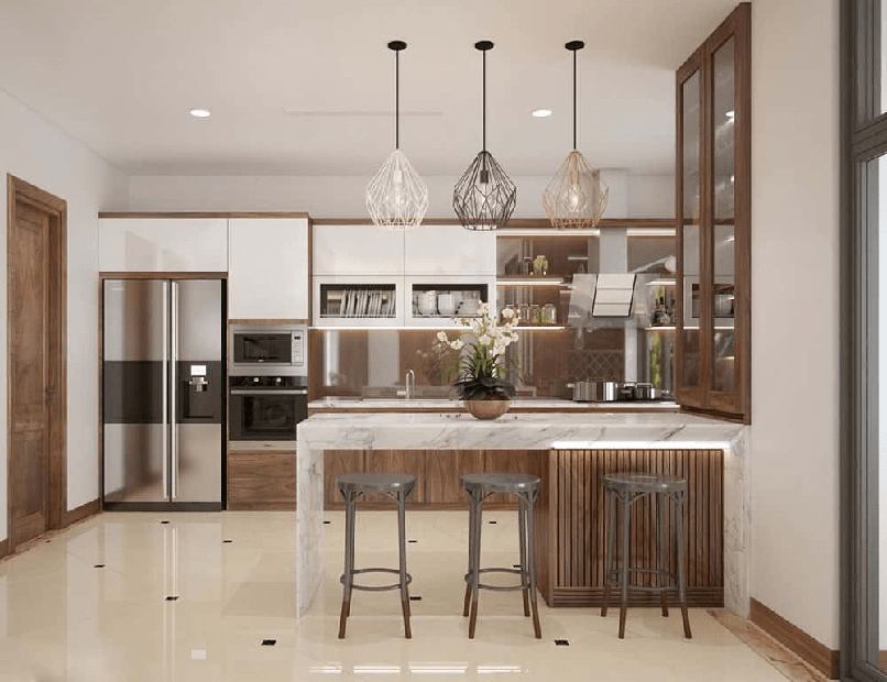 Nhiều gia đình hiện nay thường sử dụng quầy bar mini để ngăn cách không gian bếp và khách. Ngoài việc phân chia không gian thì quầy bar còn có thể làm kệ để đồ, làm bàn ăn, kệ trang trí trong không gian bếp.