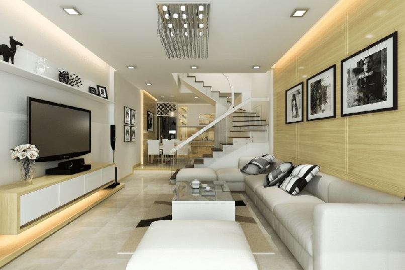 3.4 Phòng khách liền bếp 20m2 được ngăn cách bởi cầu thang