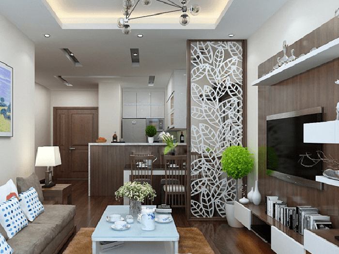 3.2 Thiết kế phòng khách liền bếp 20m2 với vách ngăn trang trí