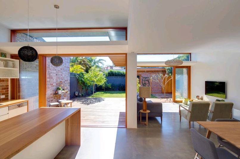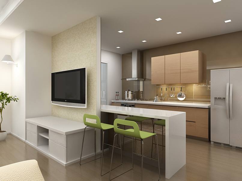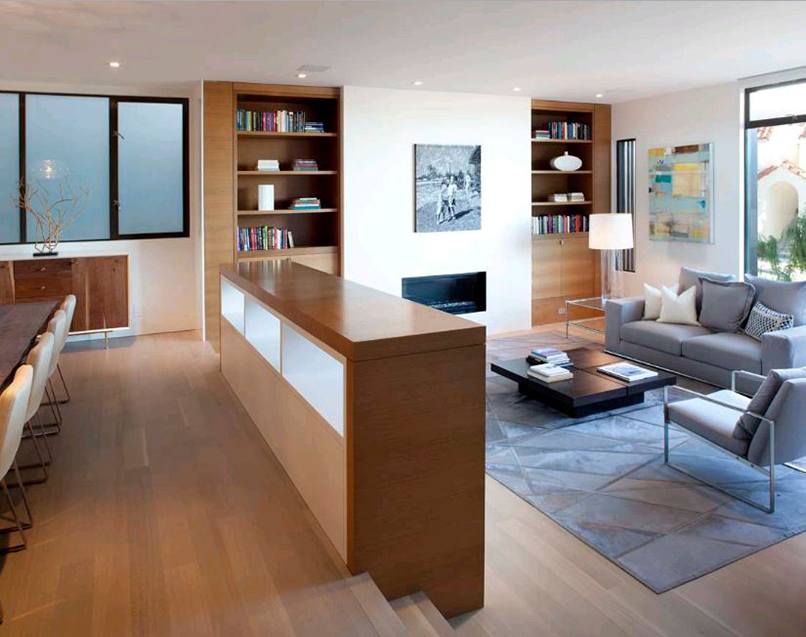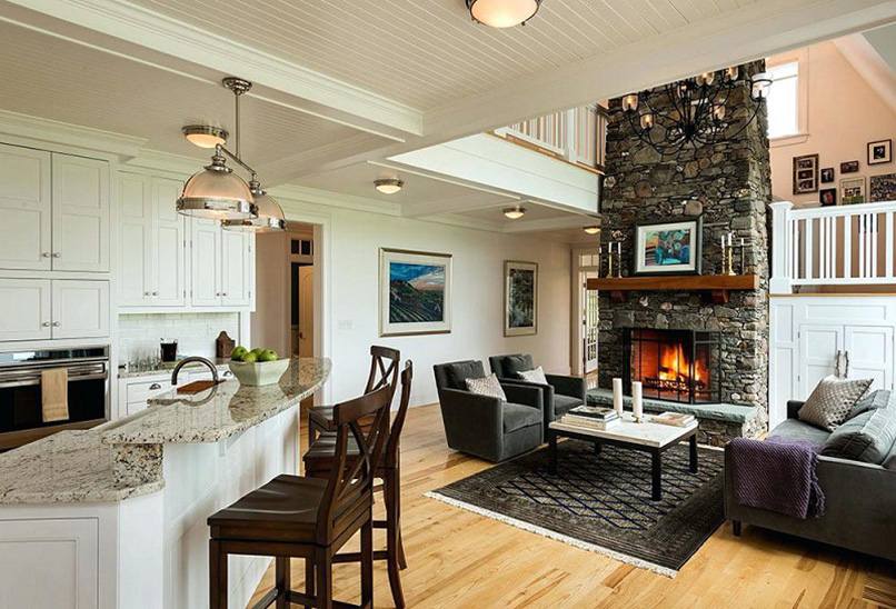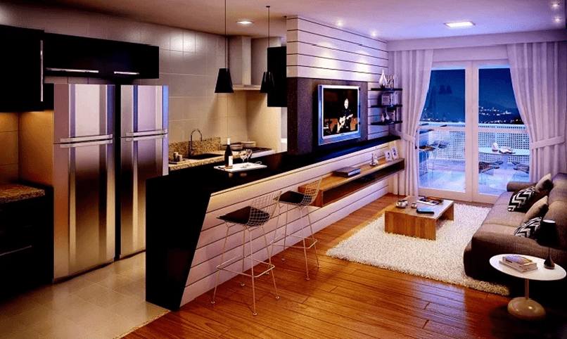 Phòng khách và bếp thông nhau này thường được áp dụng nhiều vào các kiểu nhà ống hoặc căn hộ chung cư. Nó tạo không gian mở, tận dụng thêm những phần diện tích xây tường hay vách ngăn giúp căn nhà rộng rãi hơn.