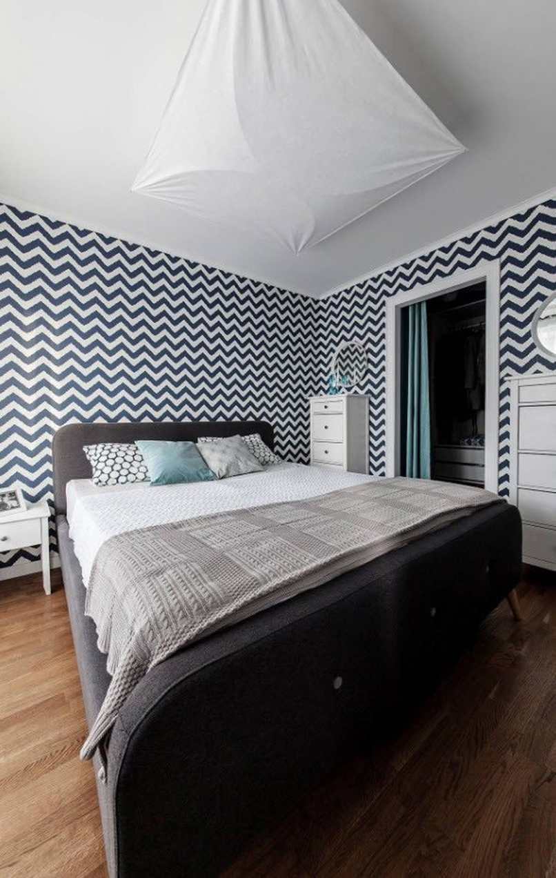 Một giải pháp thời trang sẽ nhấn mạnh bức tường phía sau giường. Ví dụ, một màu pha loãng khác hoặc sơn tường hấp dẫn sẽ làm cho căn phòng thoải mái để ngủ và nghỉ ngơi. Và chính tạo nơi này, chúng ta nên từ bỏ quyết định rằng một nội thất nhỏ nên có đầy đủ các màu sắc tươi sáng.