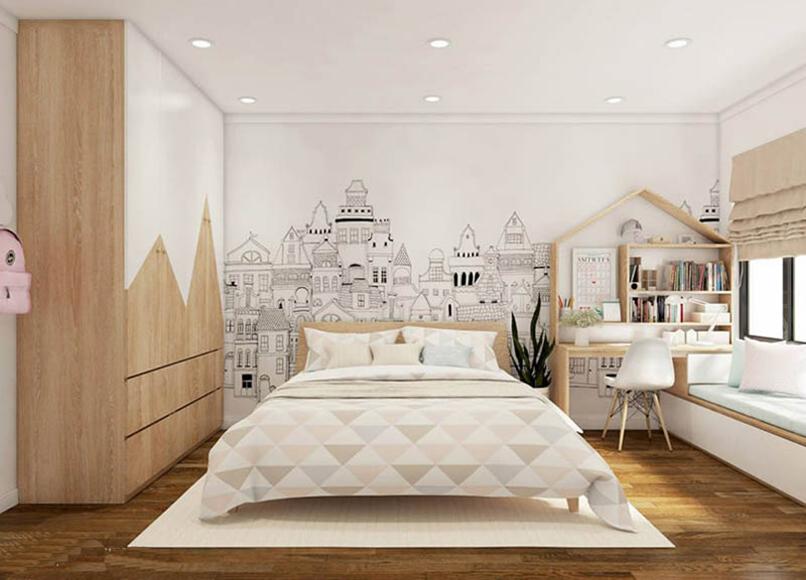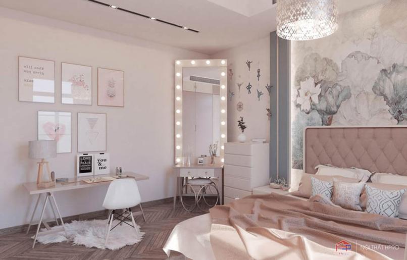 Cuối cùng, chọn hoạ tiết trang trí phù hợp. Tuỳ theo độ tuổi hiện tại, cũng có thể cân nhắc đến độ tuổi trong tương lai của bé mà bố trí hoạ tiết phù hợp. Với những phòng ngủ đẹp cho bé gái 18 tuổi này cần thể hiện được nét nữ tính, dịu dàng nhưng không kém phần trong sáng, thanh xuân.