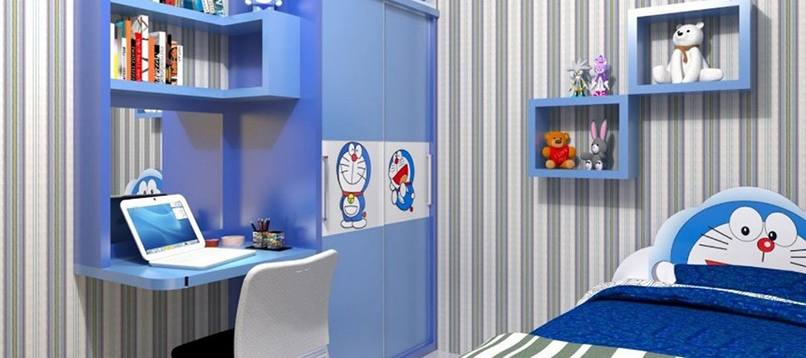 Thêm một chiếc tủ quần áo cùng bộ bàn học Doraemon để thêm hoàn thiện căn phòng. Nhất là giấy dán tường, ba mẹ có thể chọn những loại giấy có tông màu xanh hoặc trắng để dễ dàng kết hợp với các món nội thất. Một gợi ý nhỏ chính là có thể chọn những tấm decal hình doremon và những người bạn trong những chuyến phiêu lưu mà con bạn yêu thích nhất.
