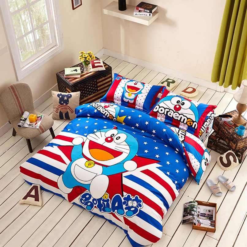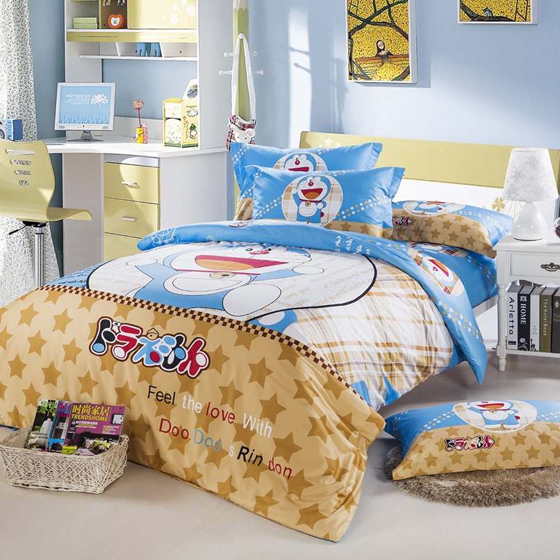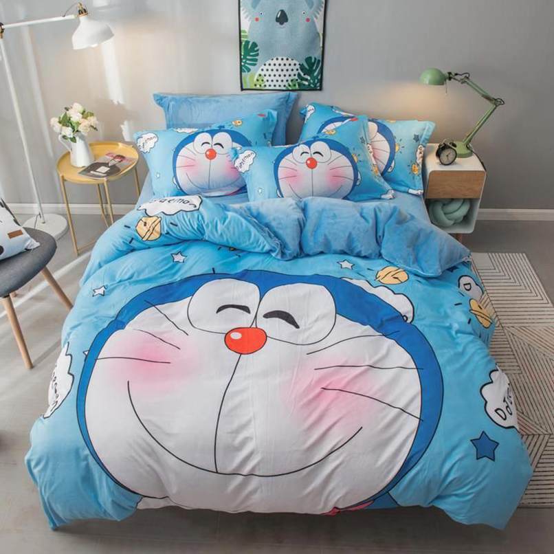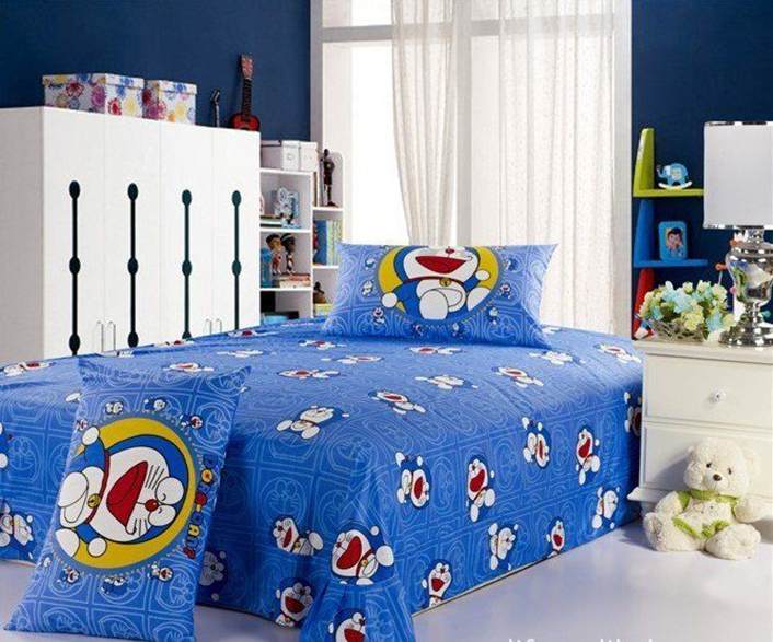 Các bậc phụ huynh có thể chọn cho bé một chiếc giường ngủ hình Doremon hay đơn giản là một bộ chăn ga có in hình chú mèo máy này để làm điểm nhấn cho căn phòng.