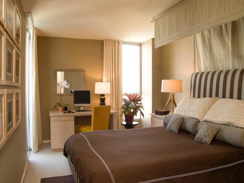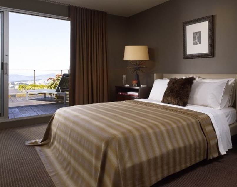 Thứ ba, phòng ngủ màu nâu nhạt tạo cho phòng ngủ trầm tĩnh, hiện đại. Phòng ngủ với điểm nhấn màu nâu sẽ tạo ra không gian thoải mái. Hơn nữa, sự kết hợp các tông màu trắng tươi sáng và nhiều vật dụng được thiết kế hiện đại góp phần làm cho phù nhủ trở nên thật hiện đại sang trọng và trẻ trung.