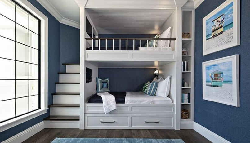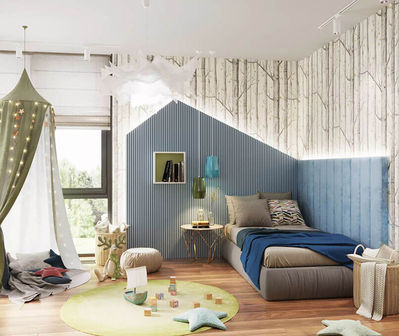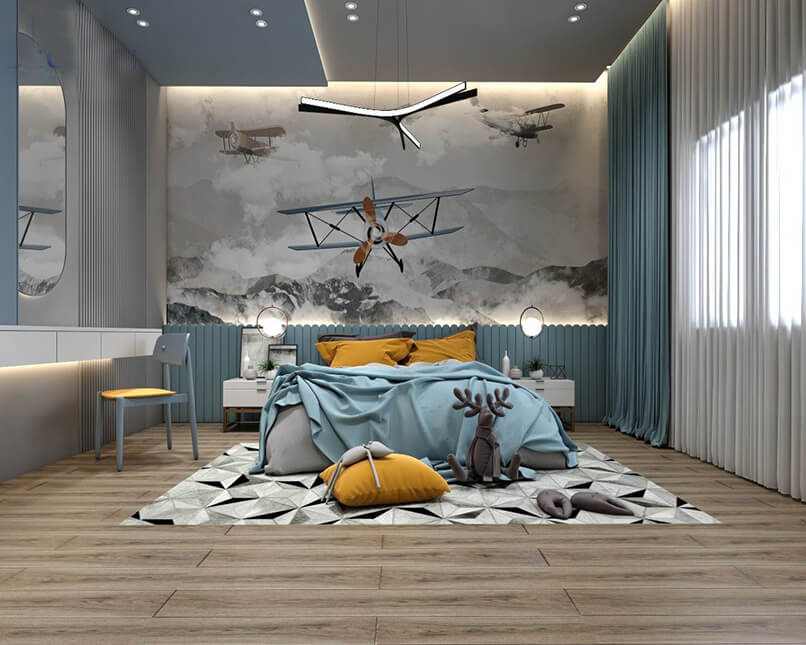 Phòng ngủ màu xanh nhẹ nhàng cho trẻ em. Hãy đem màu xanh này vào không gian của con bạn, nó sẽ đem lại không gian lớn hơn cho trẻ em vui chơi. Ngoài ra phong cách nhẹ nhàng giúp bé thoải mái, phấn chấn mỗi khi thức dậy.