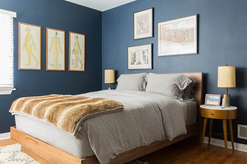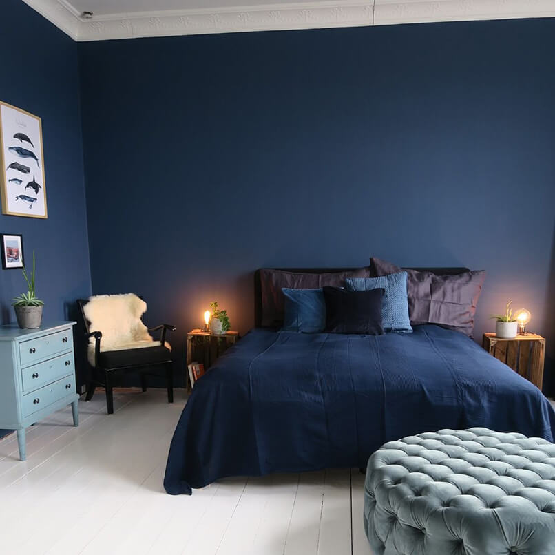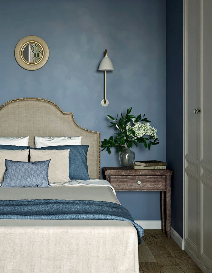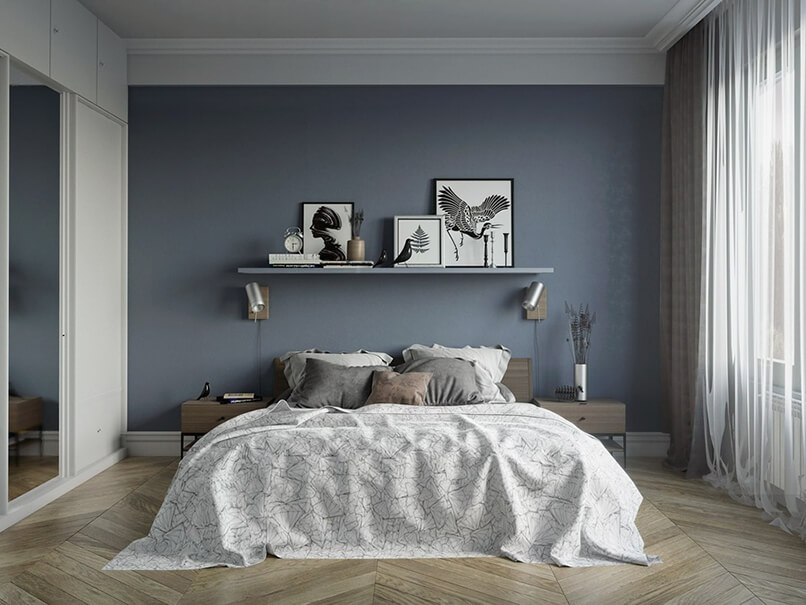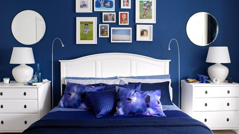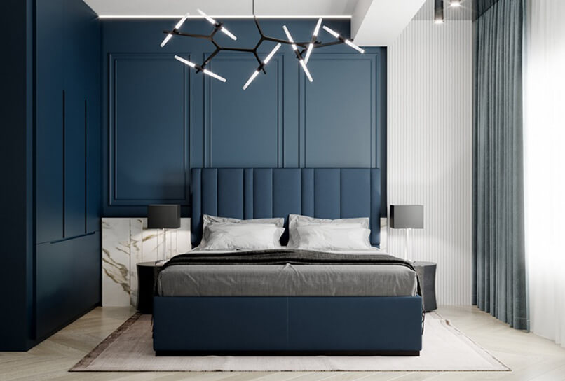 Trang trí phòng ngủ màu xanh da trời đậm cổ điển. Màu xanh đậm có thể là điểm nhấn thu hút ánh nhìn bất cứ ai. Những món nội thất đơn giản sẽ điểm xuyến thêm vào để tăng sự thu hút cũng như tính tiện dụng cho không gian.