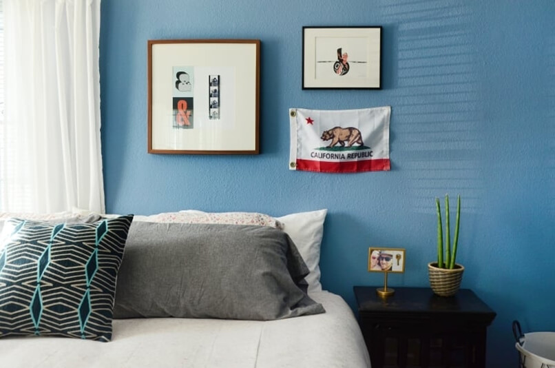 Trang trí phòng ngủ màu xanh da trời với các họa tiết. Trang trí thêm họa tiết sẽ dễ gây nên điểm nhấn cho căn phòng. Ngoài sự nhẹ nhàng bạn có thể thay đổi bằng các hình ảnh, khung ảnh tăng sự ấn tượng.
