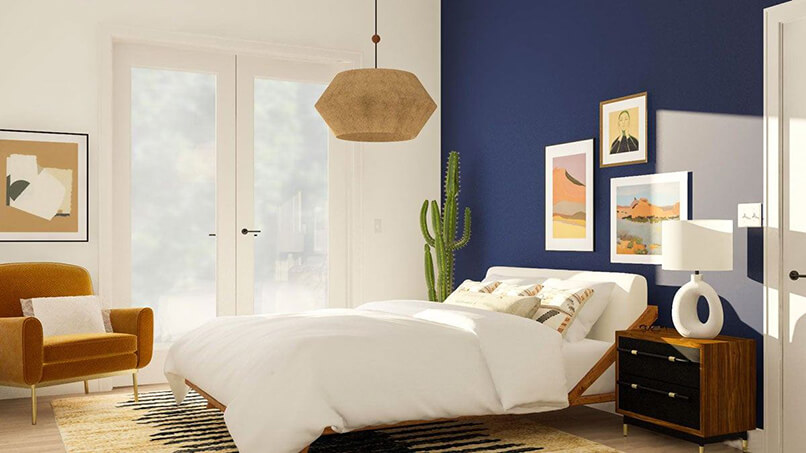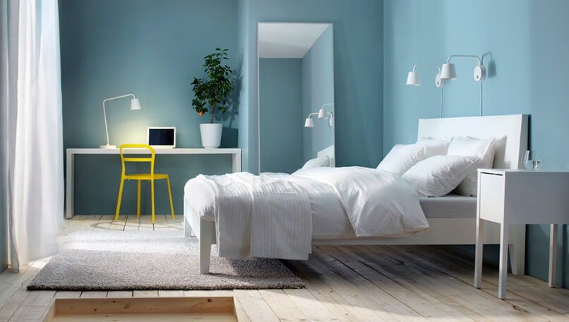 Màu xanh thanh lịch, nhẹ nhàng. Căn phòng xanh dương nhạt kèm theo đồ nội thất phong cách nhẹ nhàng. Nó thích hợp với những người thích sự đơn giản và thanh cảnh.