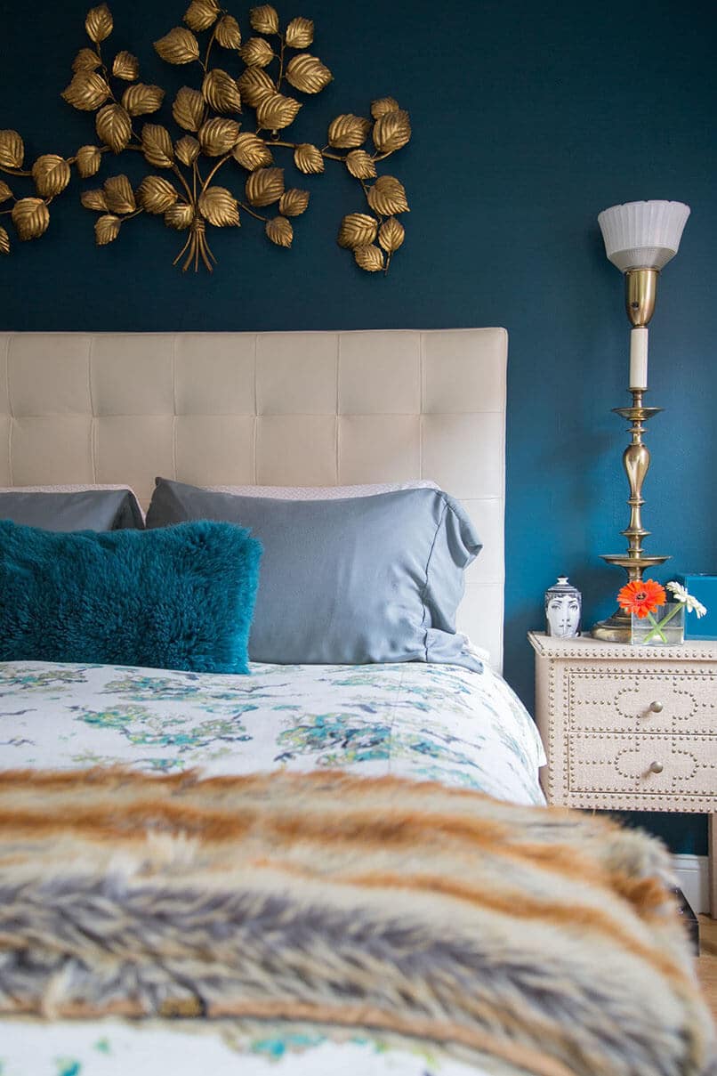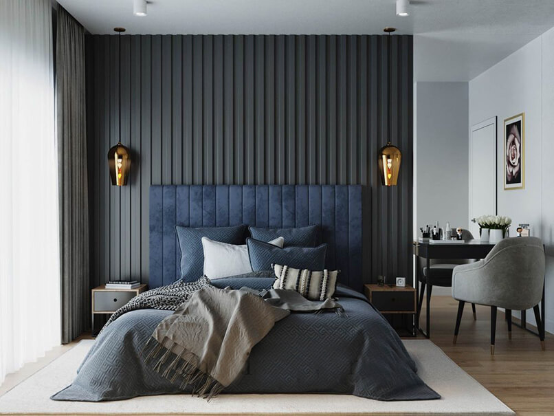 Phòng ngủ xanh đậm kết hợp với nội thất sang trọng. Màu xanh đậm mạnh mẽ kèm theo nội thất sang trọng sẽ là yếu tố ưa thích của nhiều cặp đôi hoặc gia đình trẻ. Nó gây ấn tượng thị giác mạnh mẽ cùng sự đa dạng về nội thất khiến khu vực sinh hoạt dễ dàng hơn.